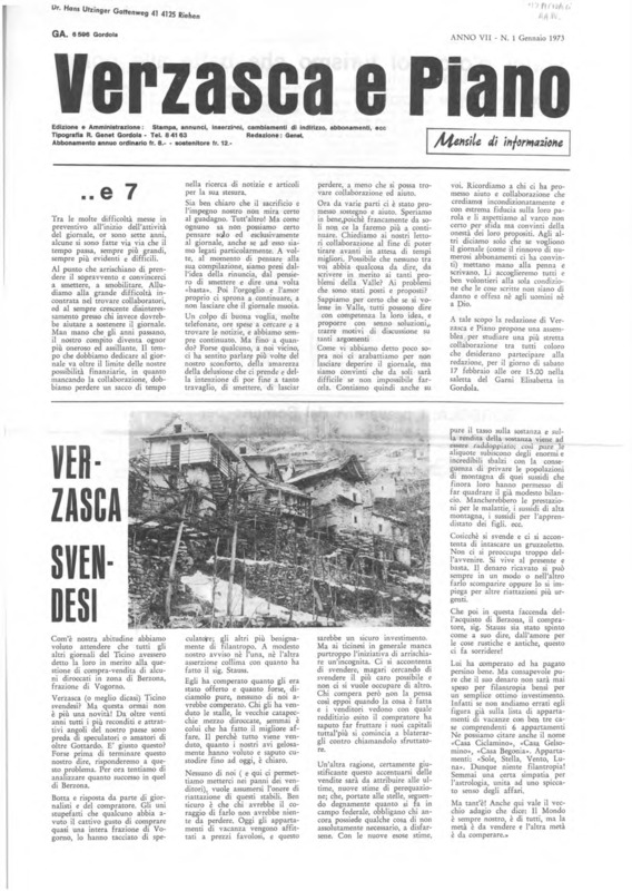 Verzasca e Piano : mensile di informazione, anno VII, n. 01, gennaio 1973