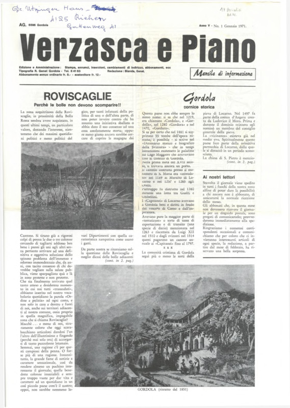 Verzasca e Piano : mensile di informazione, anno V, n. 01, gennaio 1971