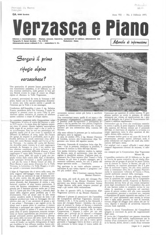 Verzasca e Piano : mensile di informazione, anno VII, n. 02, febbraio 1973