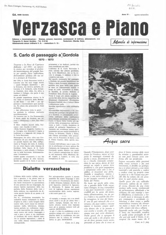 Verzasca e Piano : mensile di informazione, anno IV, n. 08, agosto settembre 1970