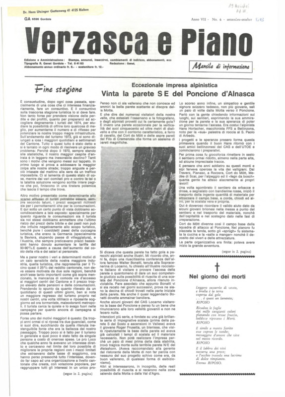 Verzasca e Piano : mensile di informazione, anno VII, n. 06, settembre ottobre 1973