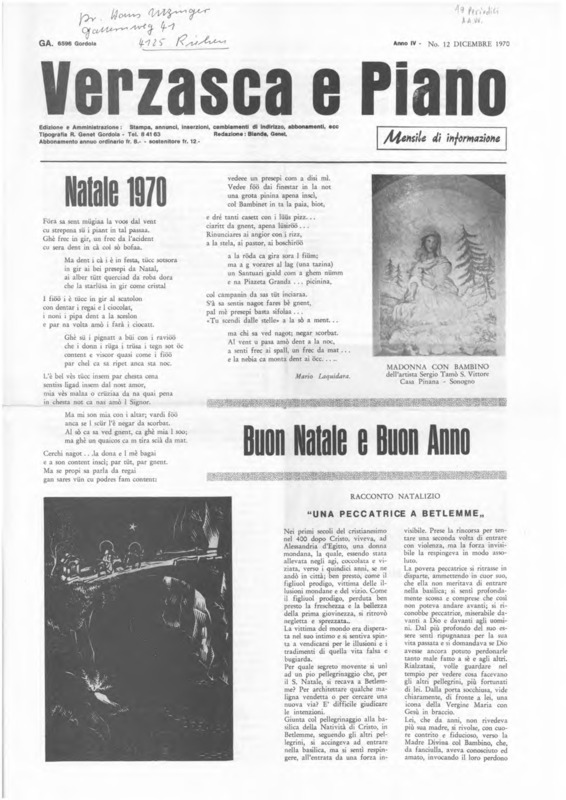 Verzasca e Piano : mensile di informazione, anno IV, n. 12, dicembre 1970