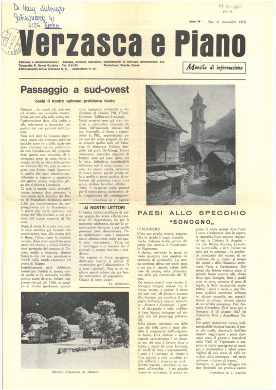 Verzasca e Piano : mensile di informazione, anno IV, n. 11, novembre 1970