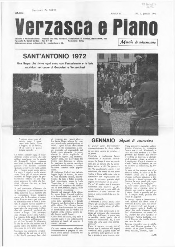 Verzasca e Piano : mensile di informazione, anno VI, n. 01, gennaio 1972