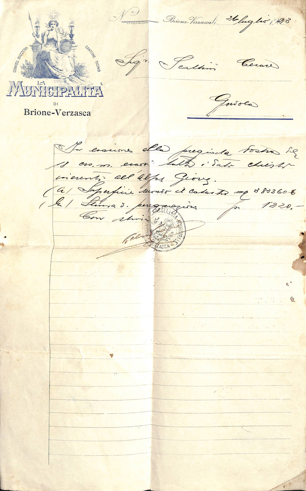In evasione alla pregiata vostra del 18 cr. m. eccovi tutti i dati chiesti inerenti all'Alpe Giove.