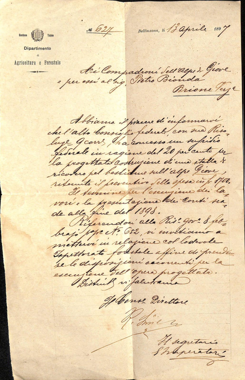 Abbiamo il piacere di informarvi che l'alto Consiglio federale, con sua Risoluz.e 9 corr, ha concesso un sussidio federale in ragione del 20 per cento per la progettata costruzione di una stalla e ricovero per bestiame sull'Alpe Giove, ritenuto il preventivo della spesa in fr 1700.