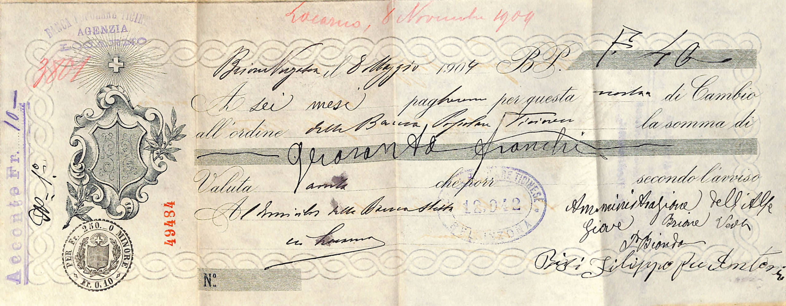 Assegno della Banca Popolare Ticinese di fr. 40.