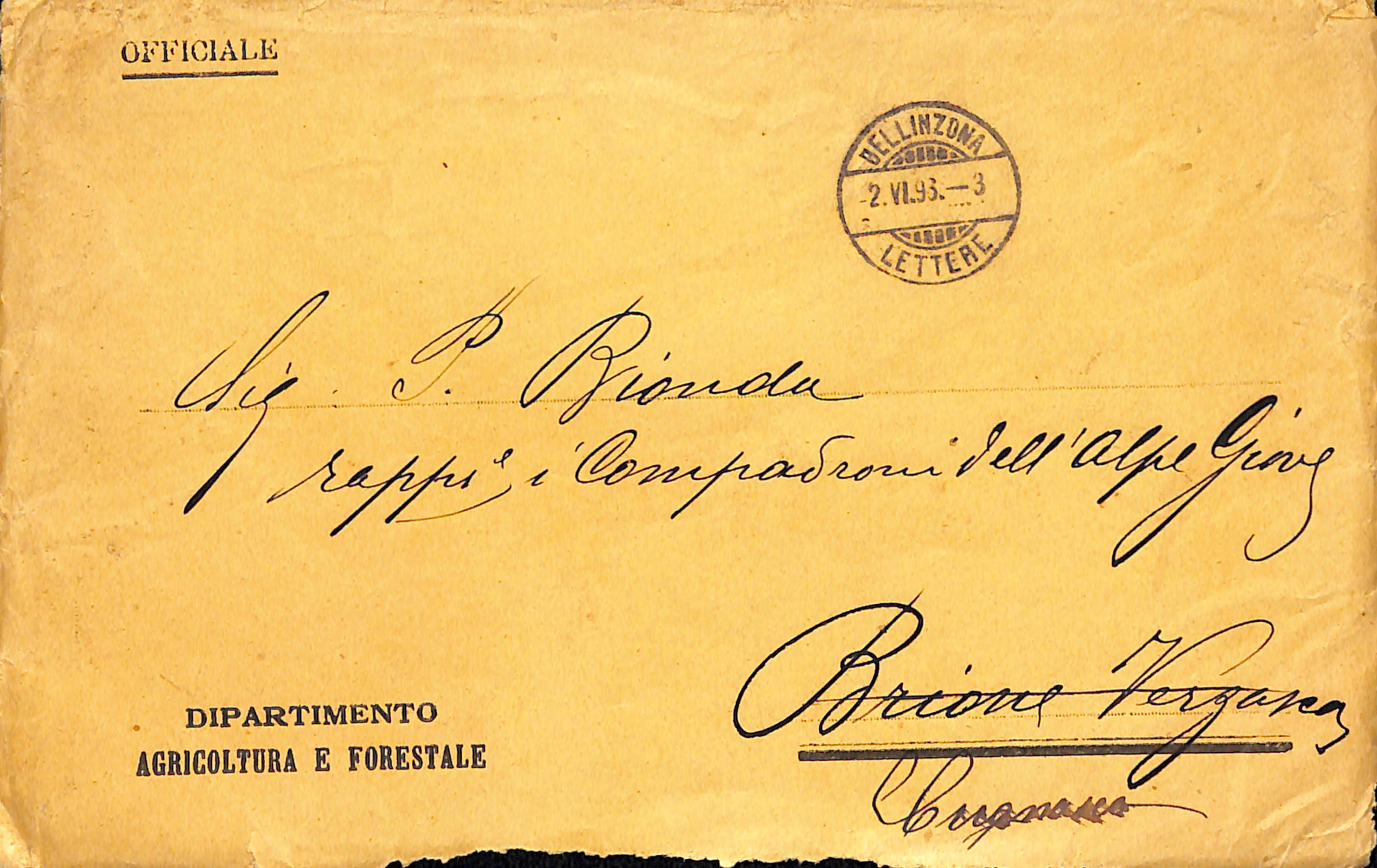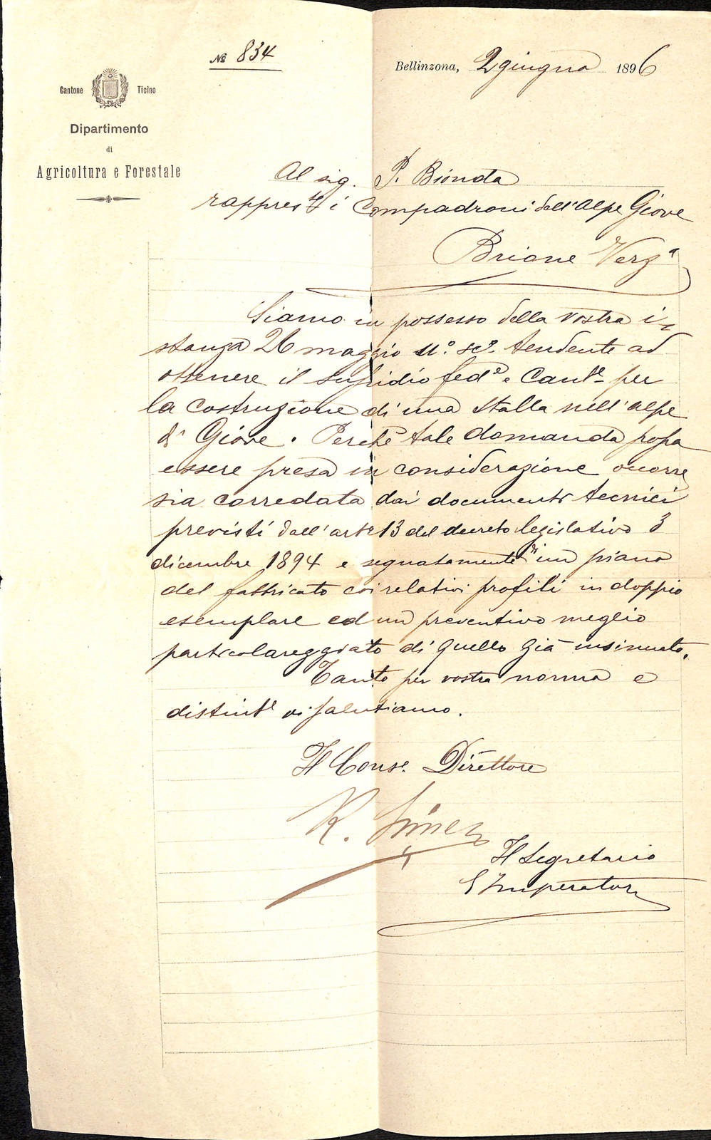 Siamo in possesso della vostra istanza 26 maggio N. sei tendente ad ottenere il sussidio fed.e e Cant.e per la costruzione di una stalla nell'Alpe di Giove. Perché tale domanda possa essere presa in considerazione occorre sia corredata dai documenti tecnici previsti dall'art. 13 del decreto legislativo 3 dicembre 1894 e segnatamente di un piano del fabbricato coi relativi profili in doppio esemplare ed un preventivo meglio particolareggiato di quello già insinuato.