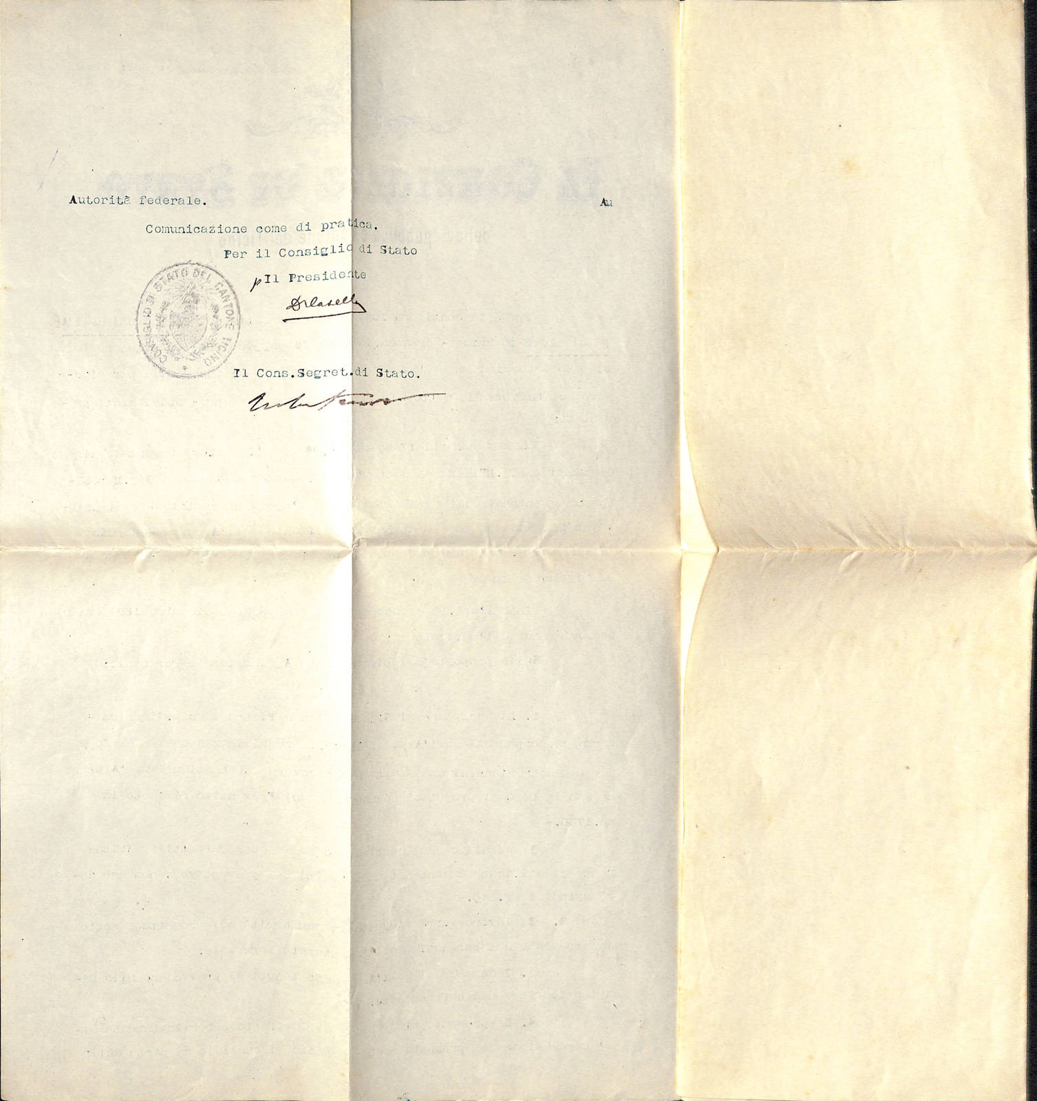 Risoluzione dattiloscritta del Consiglio di Stato contenuta nella busta del dipartimento agricoltura del 2 giugno 1896.