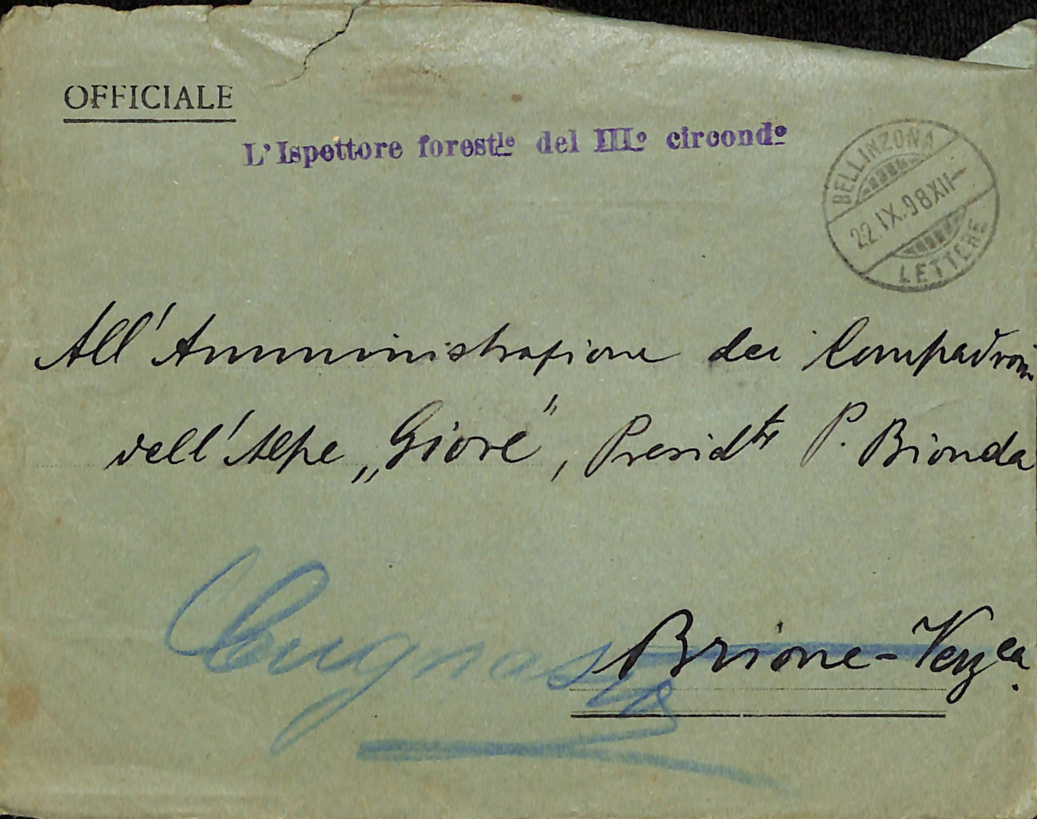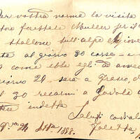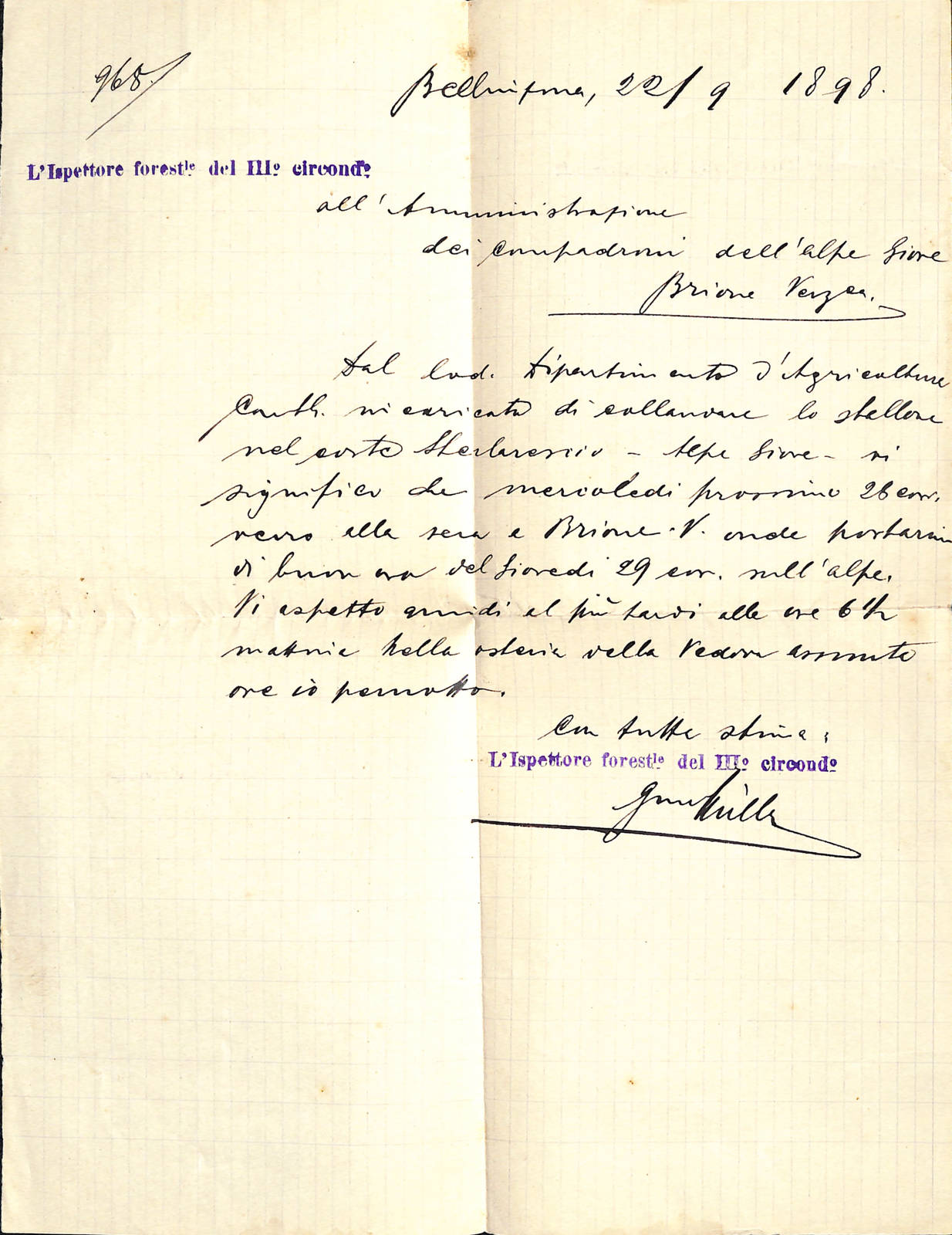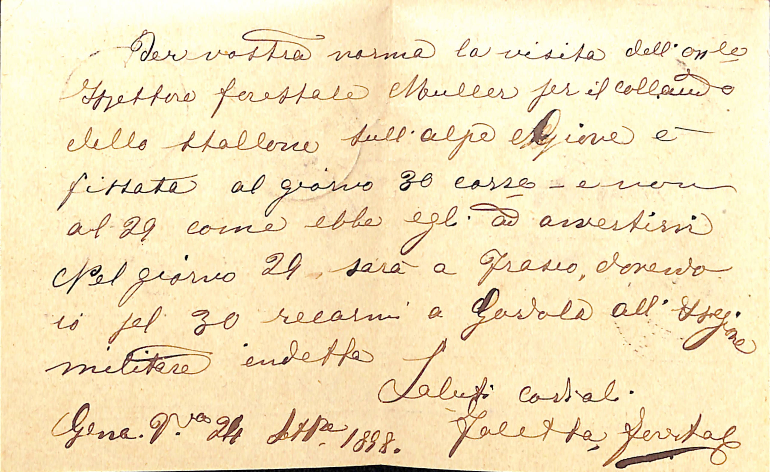 Per vostra norma la visita dell'on.le Ispettore forestale Muller per il collaudo dello stallone sull'alpe Giove è fissata al giorno 30 corr. - e non al 29 come ebbe egli ad avvertirvi
