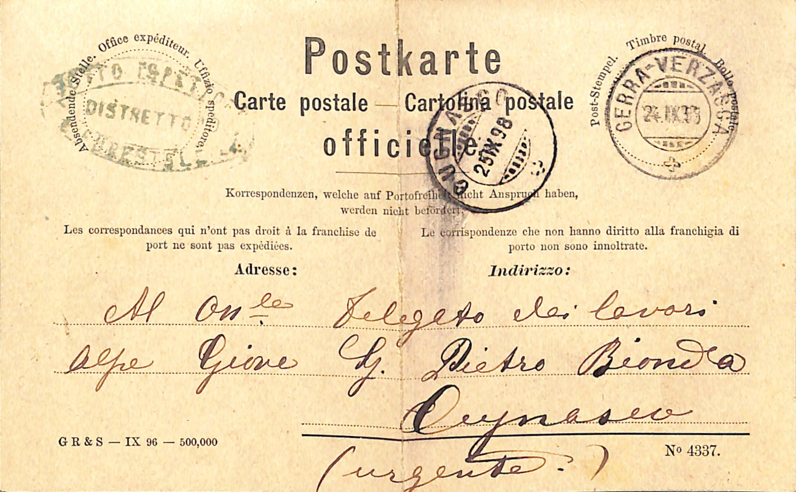All'On.le delegato dei lavori Alpe Giove S. Pietro Bionda