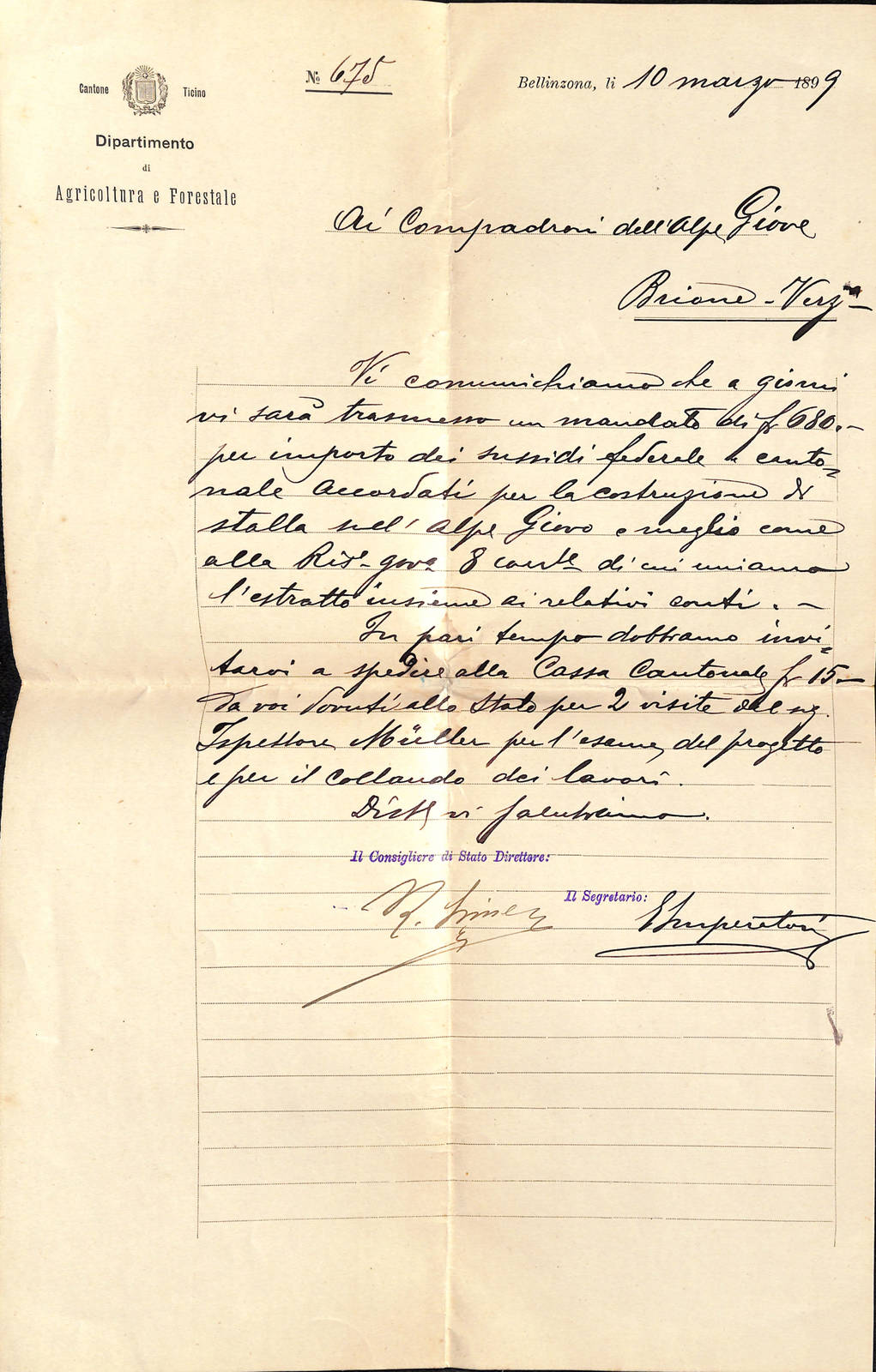 Vi comunichiamo che a giorni vi sarà trasmesso un mandato di fr. 680.- per importo dei sussidi federale e cantonale accordati per la costruzione di stalla nell'Alpe Giovo e meglio come alla Ris. gov. 8 corr.e di cui uniamo l'estratto insieme ai relativi atti.