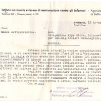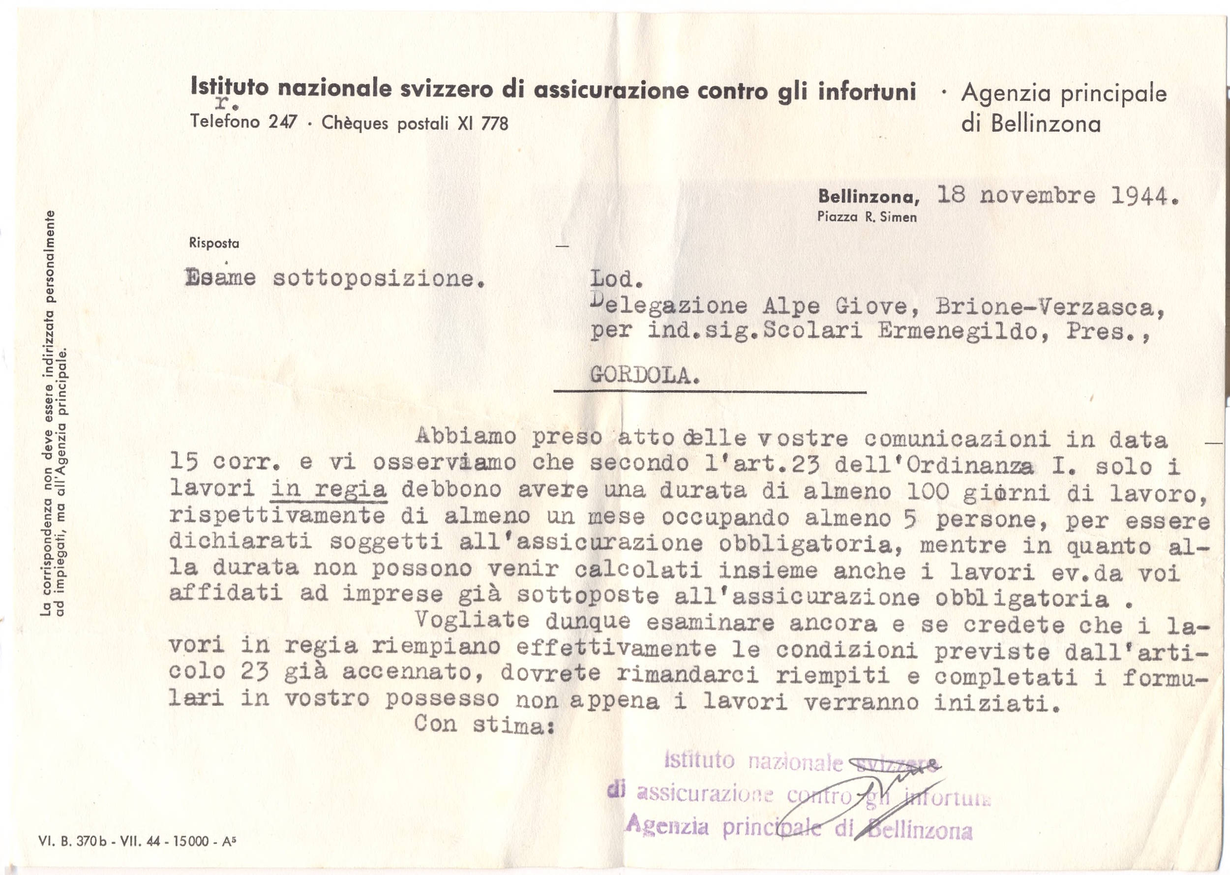 Abbiamo preso atto delle vostre comunicazioni in data 15 corr. e vi osserviamo che secondo l'art. 23 dell'Ordinanza I. solo i lavori in regia debbono avere una durata di almeno 100 giorni di lavoro, rispettivamente d almeno un mese occupando almeno 5 persone, per essere dichiarati soggetti all'assicurazione obbligatoria, mentre in quanto alla durata non possono venir calcolati insieme anche i lavori ev. da voi affidati ad imprese già sottoposte all'assicurazione obbligatoria. Vogliate dunque esaminare ancora e se credete che i lavori in regia riempiano effettivamente le condizioni previste dall'articolo 23 già accennato, dovrete rimandarci riempiti e completati i formulari in vostro possesso non appena i lavori verranno iniziati.