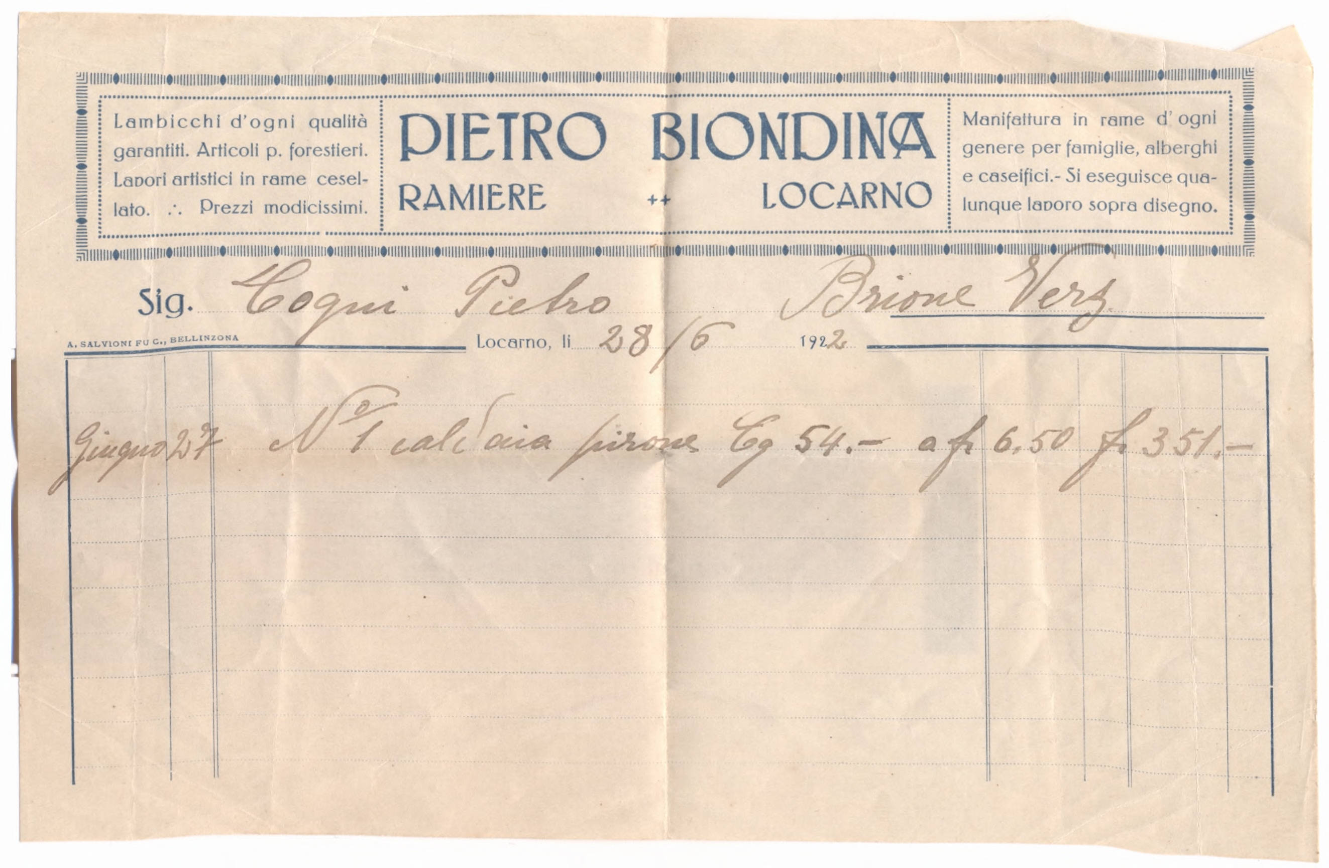 Giugno 27 N. 1 Caldaia [...] Eg. 54 a fr. 6.50 fr. 351.- - Oggetto