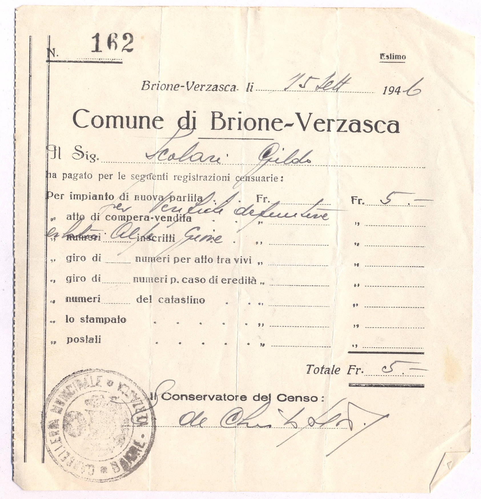 Per impianto di nuova partita Fr. .... Fr. 5.-