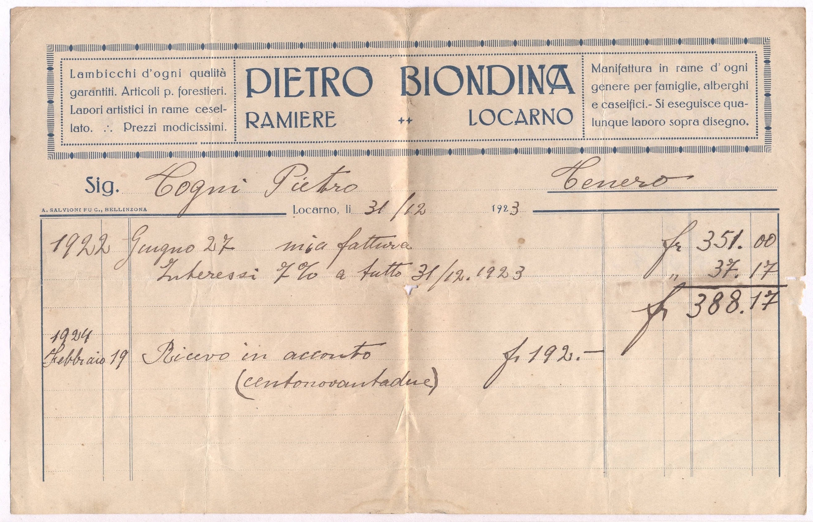 Febbraio 19 Ricevo in acconto fr. 192.- (centonovantadue)