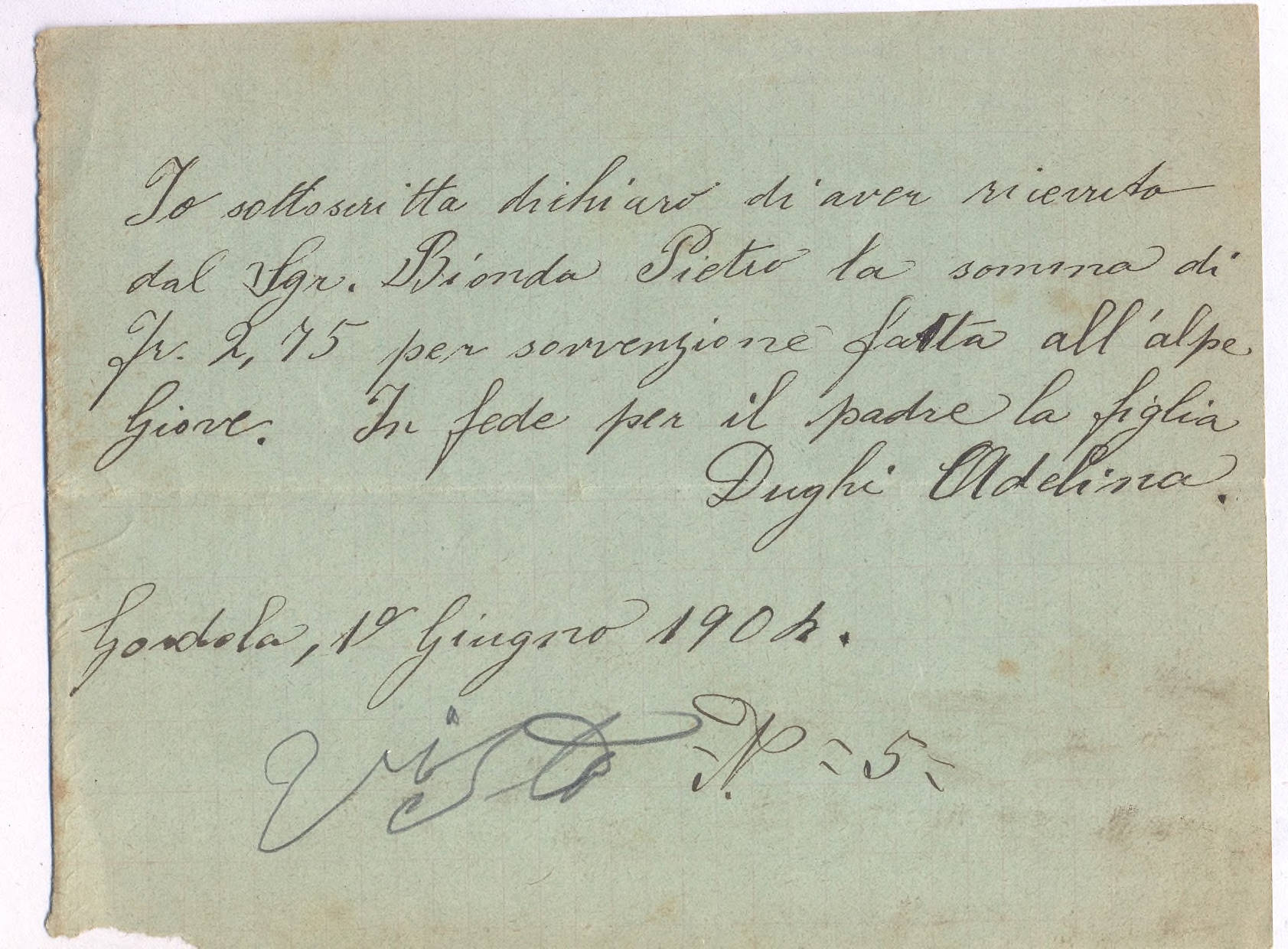 Io sottoscritta dichiaro di aver ricevuto dal Sig. Bionda Pietro la somma di Fr. 2,75 per sovvenzione fatta all'alpe Giove. In fede per il padre la figlia Dughi Adelina