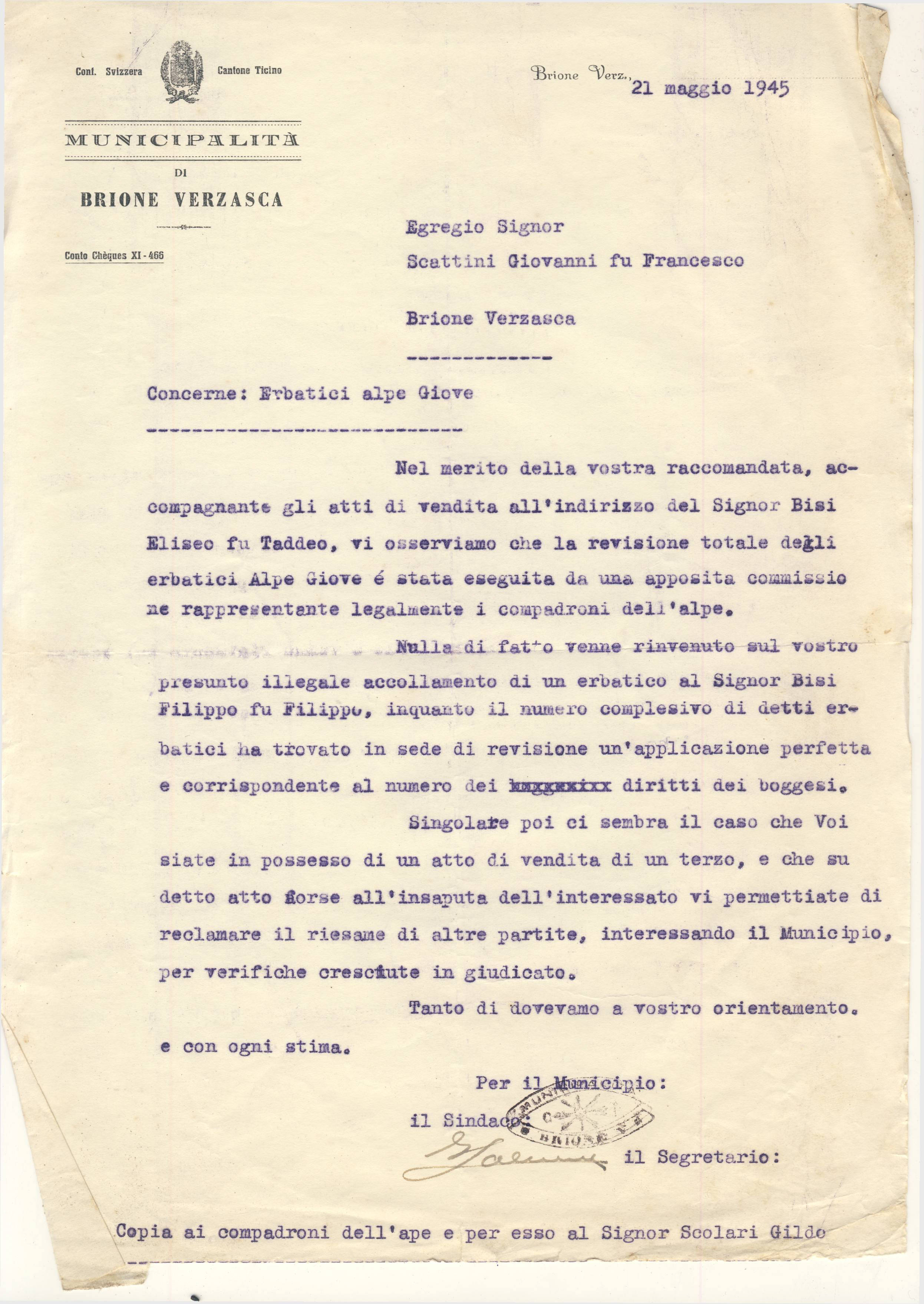 Nel merito della vostra raccomandata, accompagnante gli atti di vendita all’indirizzo del Signor Bisi Eliseo fu Taddeo, vi osserviamo che la revisione totale degli erbatici Alpe Giove e stata eseguita da una apposita commissione rappresentante legalmente i compadroni dell’alpe.