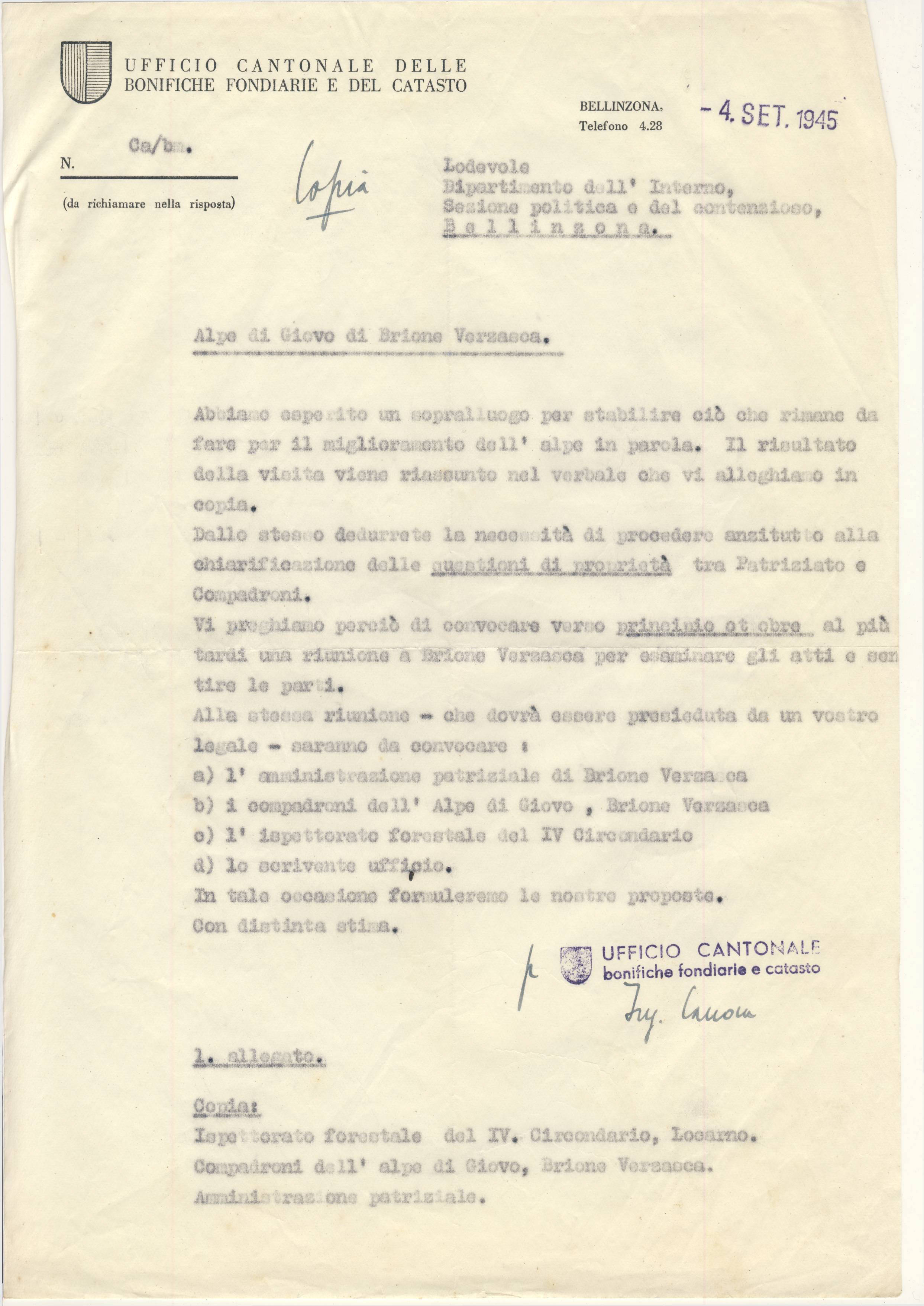 Vi preghiamo perciò di convocare verso principio ottobre al più tardi una riunione a Brione Verzasca per esaminare gli atti e sentire le parti.