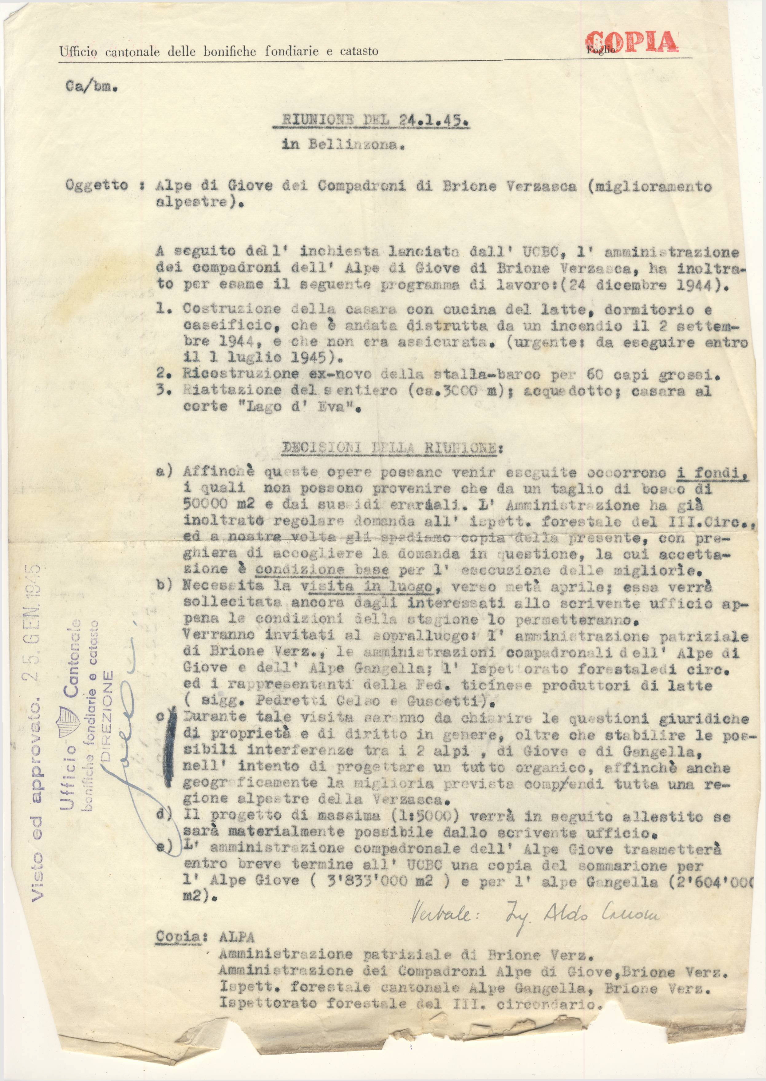 A seguito dell'inchiesta lanciata dall'UCBC, l’ amministrazione dei compadroni dell'Alpe di Giove di Brione Verzasca, ha inoltrato per esame il seguente programma di lavoro: (24 dicembre 1944).