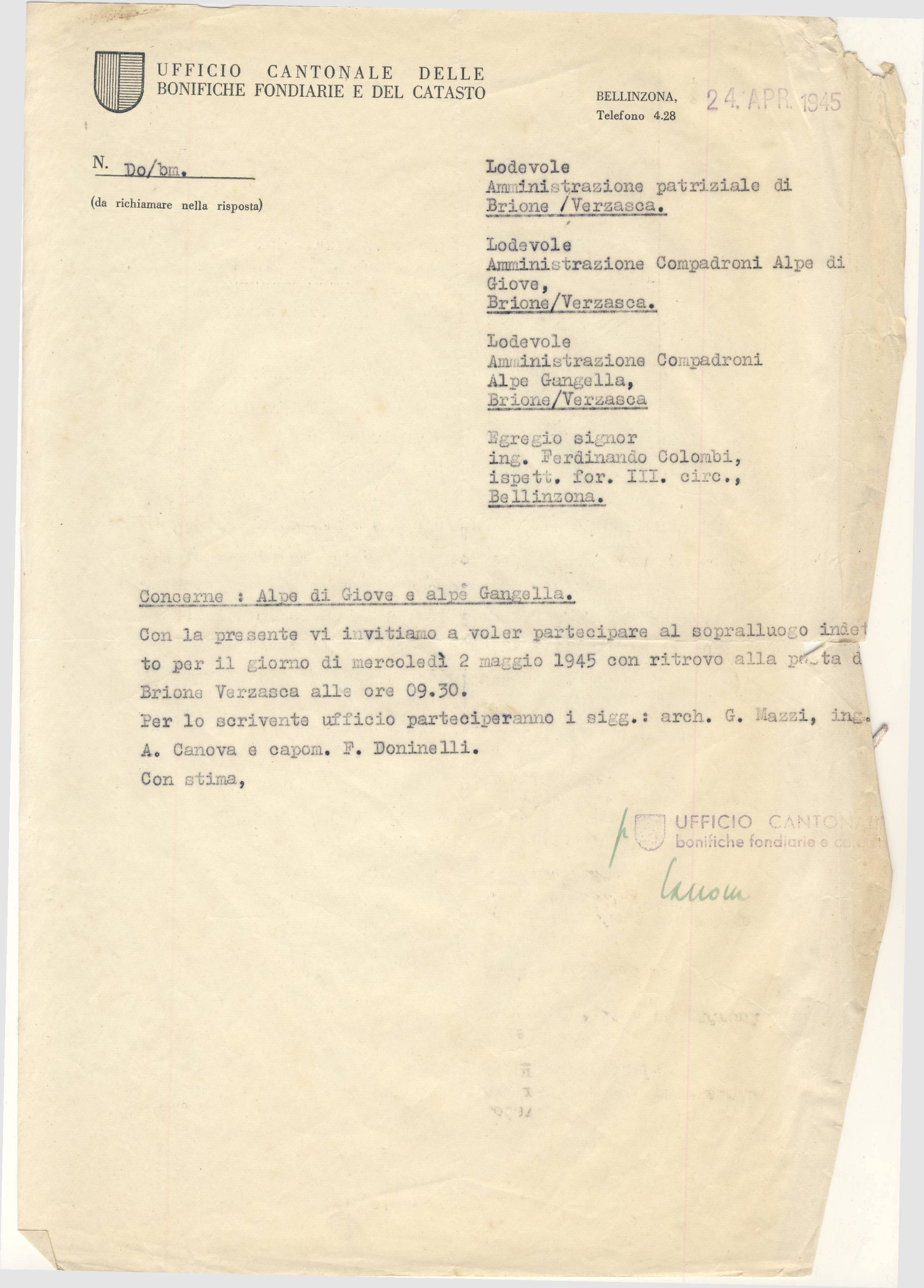 Con la presente vi invitiamo a voler partecipare al sopralluogo indetto per il giorno di mercoledì 2 maggio 1945 con ritrovo alla posta d Brione Verzasca alle ore 09.30.