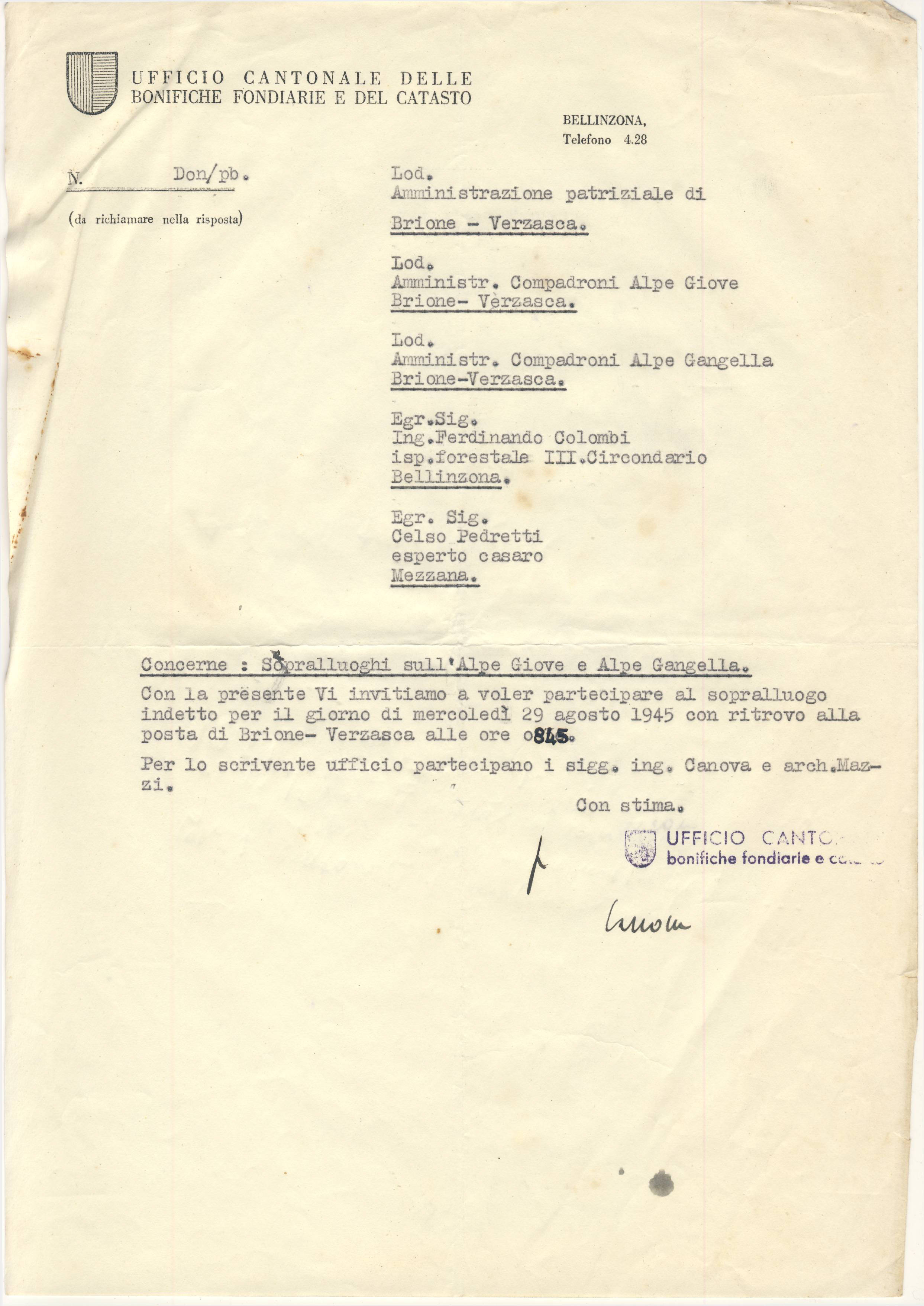 Con la presente Vi invitiamo a voler partecipare al sopralluogo indetto per il giorno di mercoledì 29 agosto 1945 con ritrovo alla posta di Brione- Verzasca alle ore 0845.