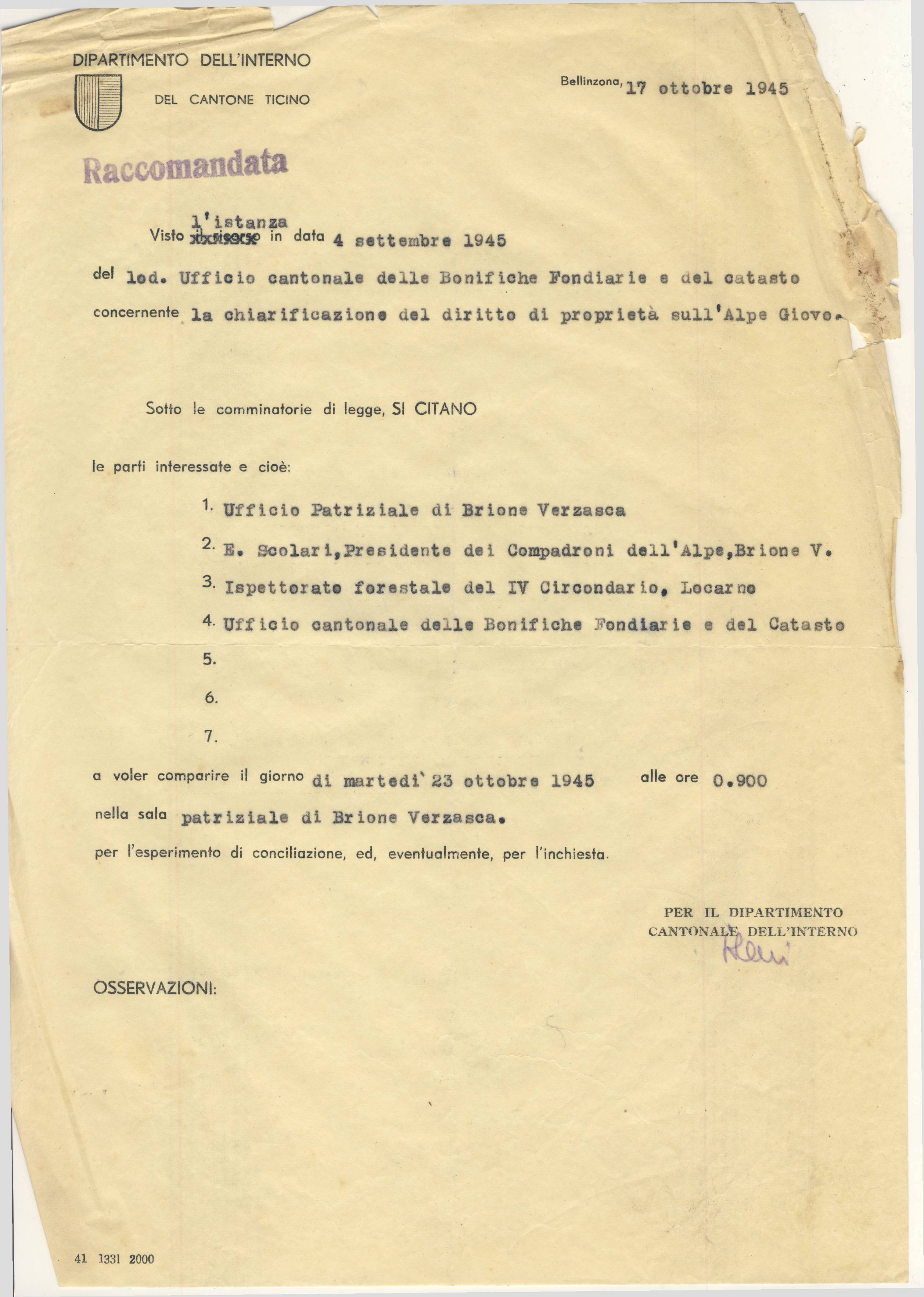 a voler comparire il giorno martedì 23 ottobre 1945 alle ore 0.900 nella sala patriziale di Brione Verzasca, per l’esperimento di conciliazione, ed, eventualmente, per l’inchiesta.