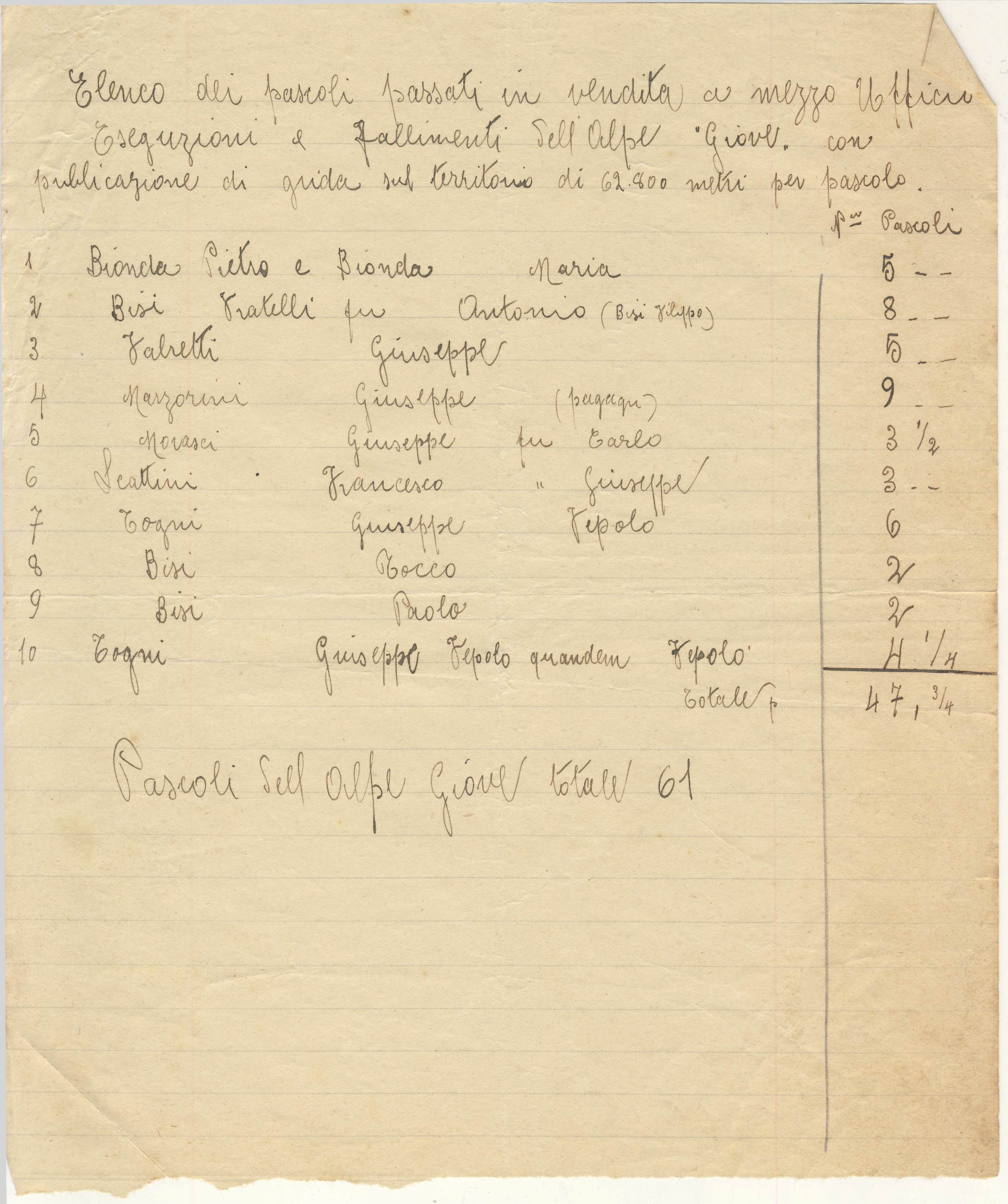 Elenco dei pascoli passati in vendita a mezzo Ufficio Esecuzioni e fallimenti dell'Alpe Giove, con pubblicazione di grida sul territorio di 62.800 metri per pascolo.