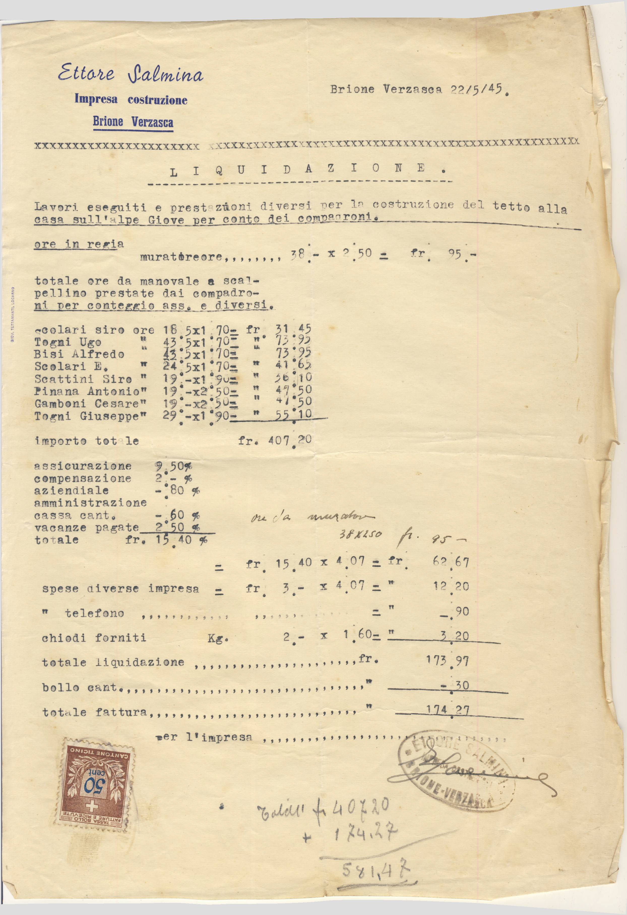 Lavori eseguiti e prestazioni diversi per la costruzione del tetto alla casa sull’alpe Giove per conto dei compadroni
