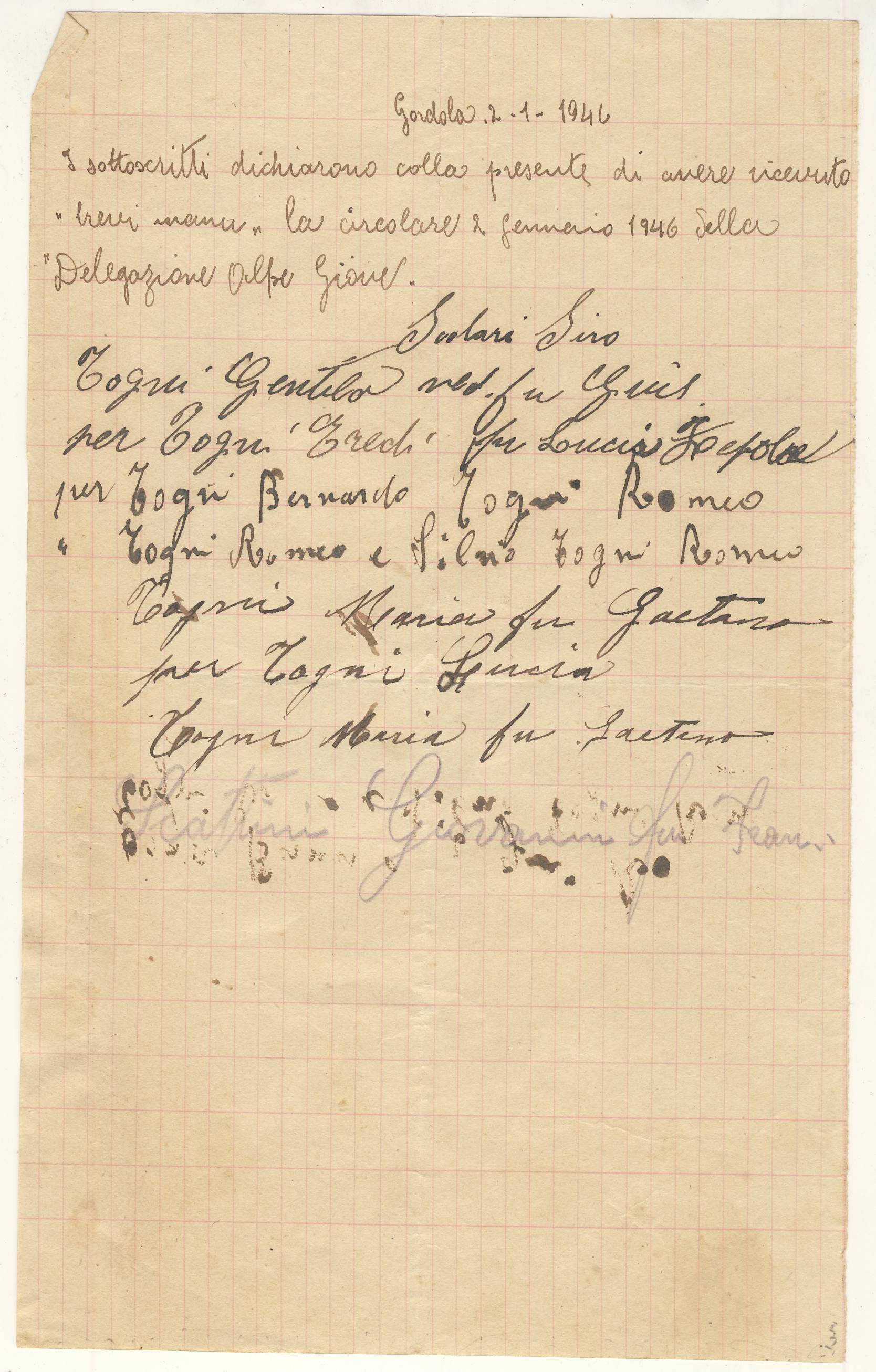 I sottoscritti dichiarano di avere ricevuto "brevi manu" la circolare 2 gennaio 1946 della "Delegazione Alpe Giove.