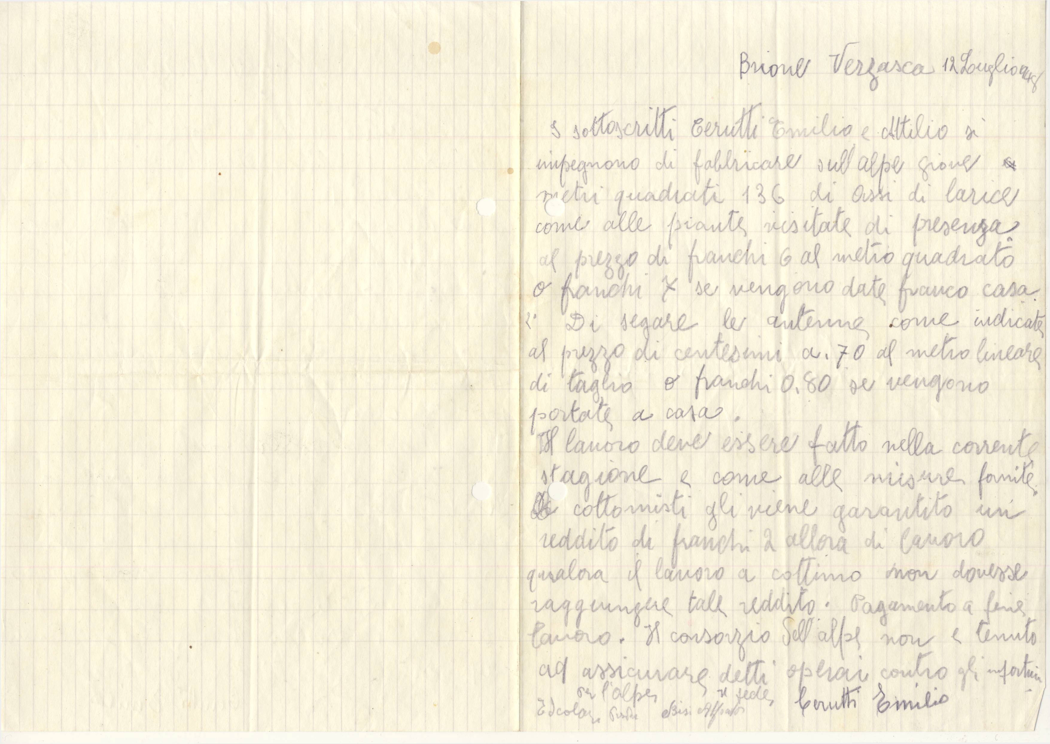 I sottoscritti Cerutti Emilio e Attilio si impegnano di fabbricare sull Alpe Giove metri quadrati 136 di assi di larice come alle piante visitate di presenza al prezzo di franchi 6 al metro quadrato o franchi 7 se vengono date franco casa