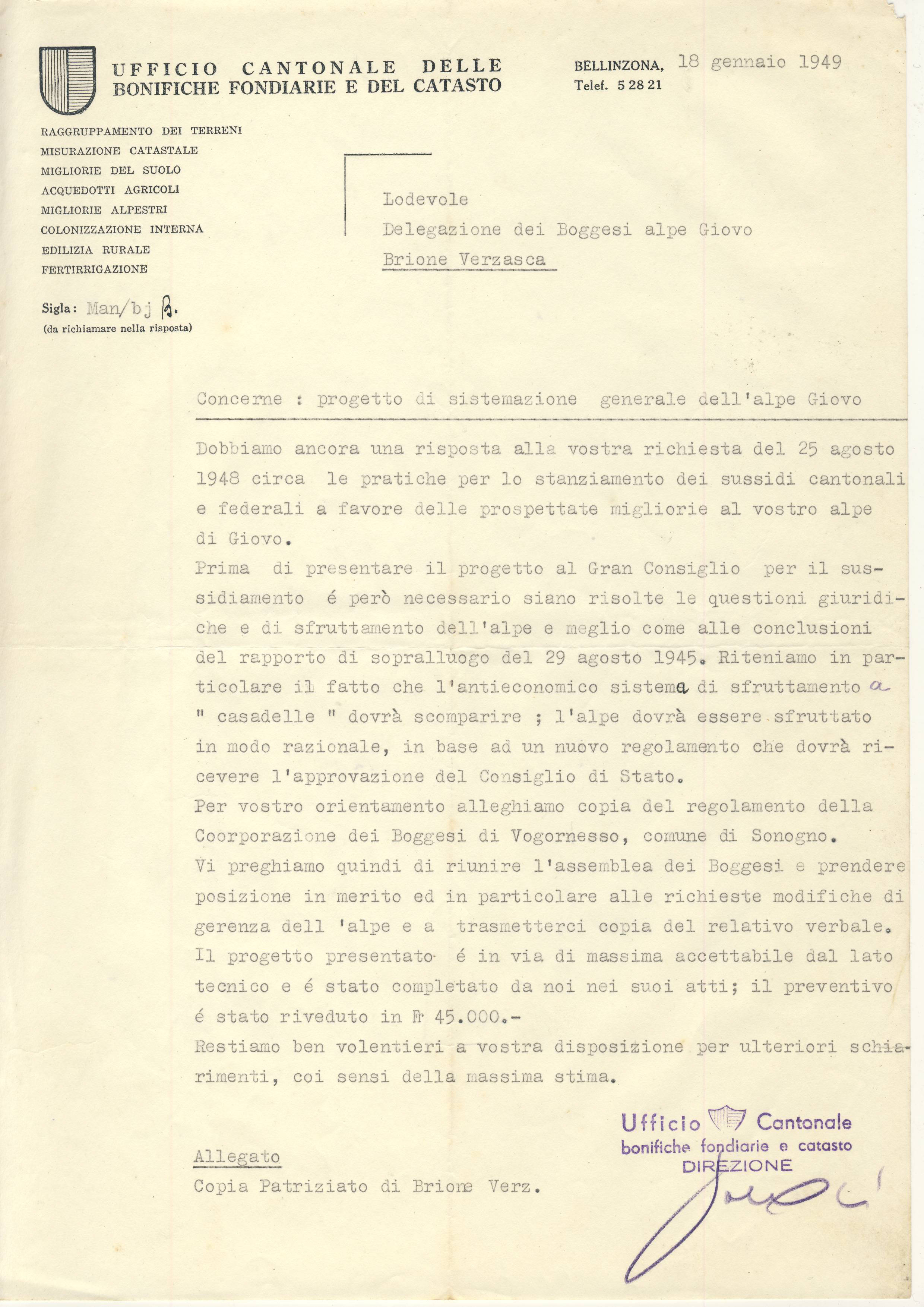 Vi preghiamo quindi di riunire l'assemblea dei Boggesi e prendere posizione in merito ed in particolare alle richieste modifiche di gerenza dell'alpe e a trasmetterci copia del relativo verbale. Il progetto presentato é in via di massima accettabile dal lato tecnico e é stato completato da noi nei suoi atti; il preventivo é stato riveduto in Fr 45.000.-