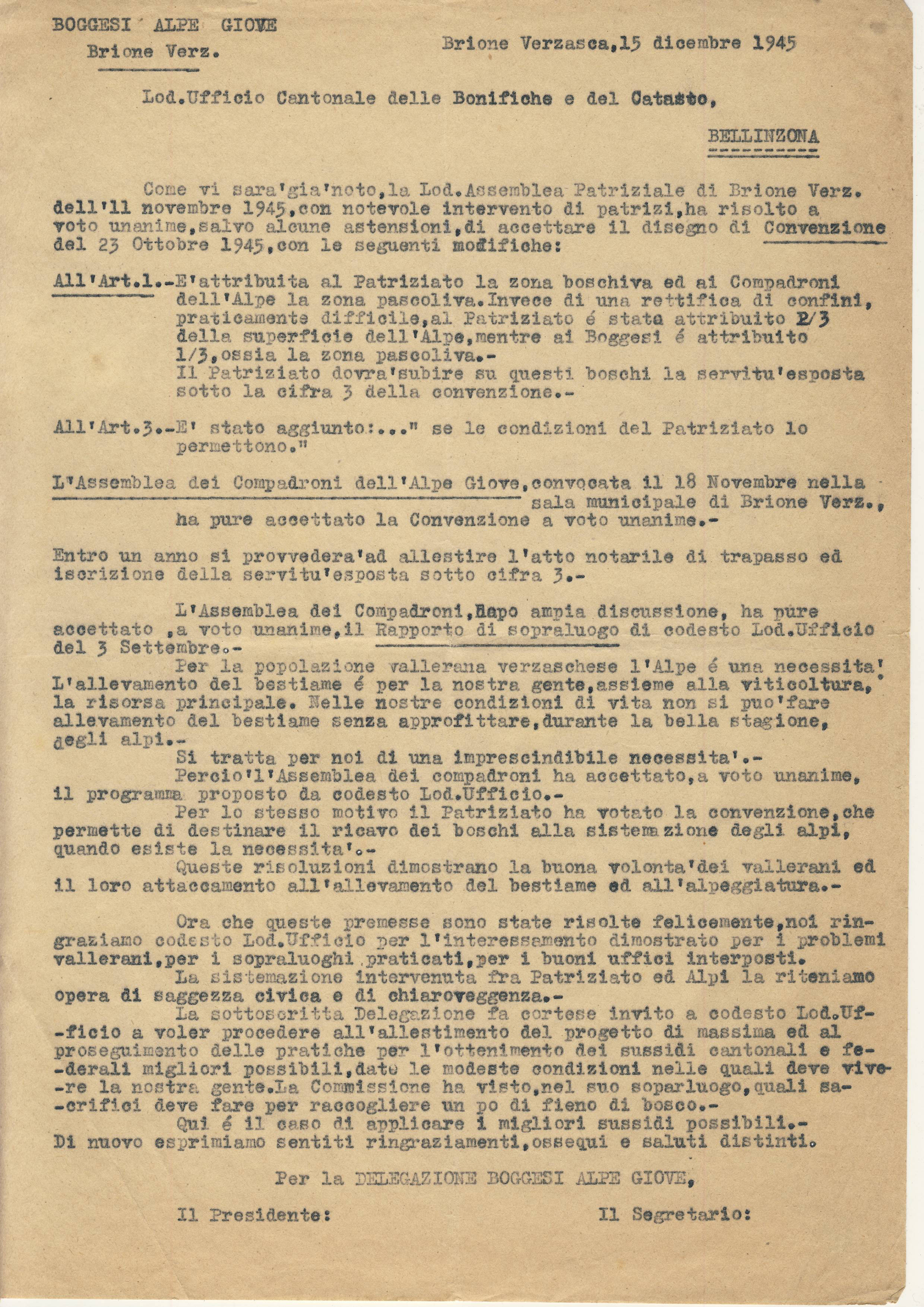 Come vi sarà già noto, la Lod. Assemblea Patriziale di Brione Verz, dell’11 novembre 1945, con notevole intervento di patrizi, ha risolto a voto unanimee, salvo alcune astensioni, di accettare il disegno di Convenzione del 23 Ottobre 1945,con le seguenti modifiche: