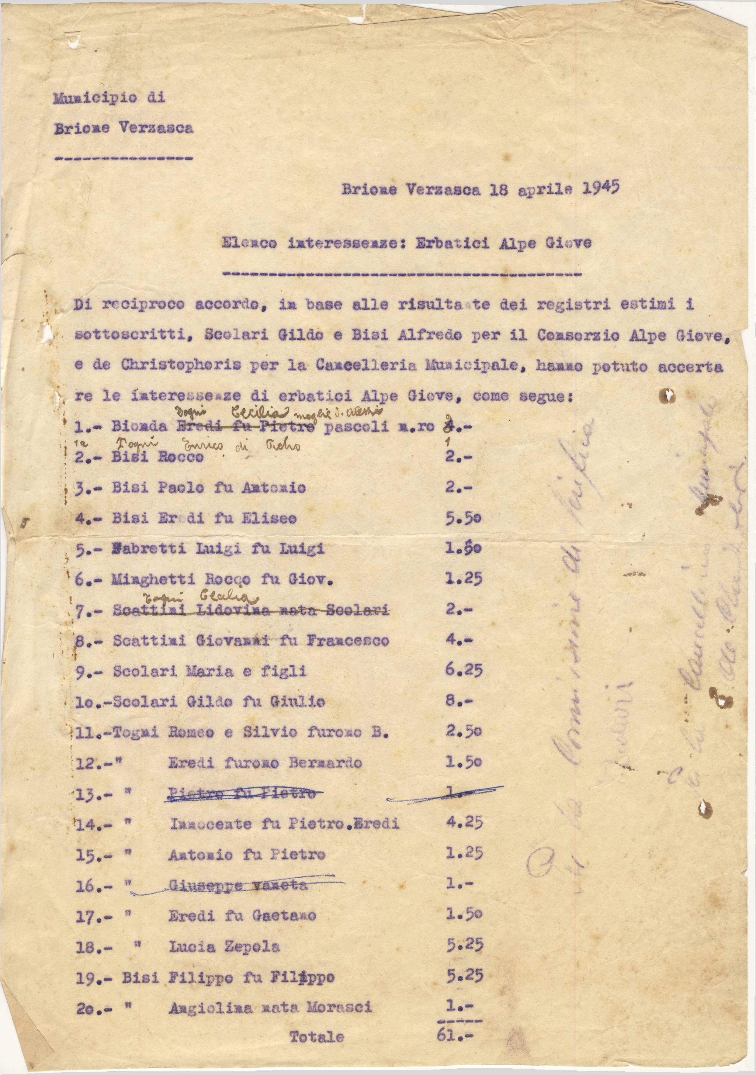 Di reciproco accordo, in base alle risultante dei registri estimi i sottoscritti, Scolari Gildo e Bisi Alfredo per il Consorzio Alpe Giove, e de Christophoris per la Cancelleria Municipale, hanno potuto accertare le interessenze di erbatici Alpe Giove, come segue:
