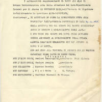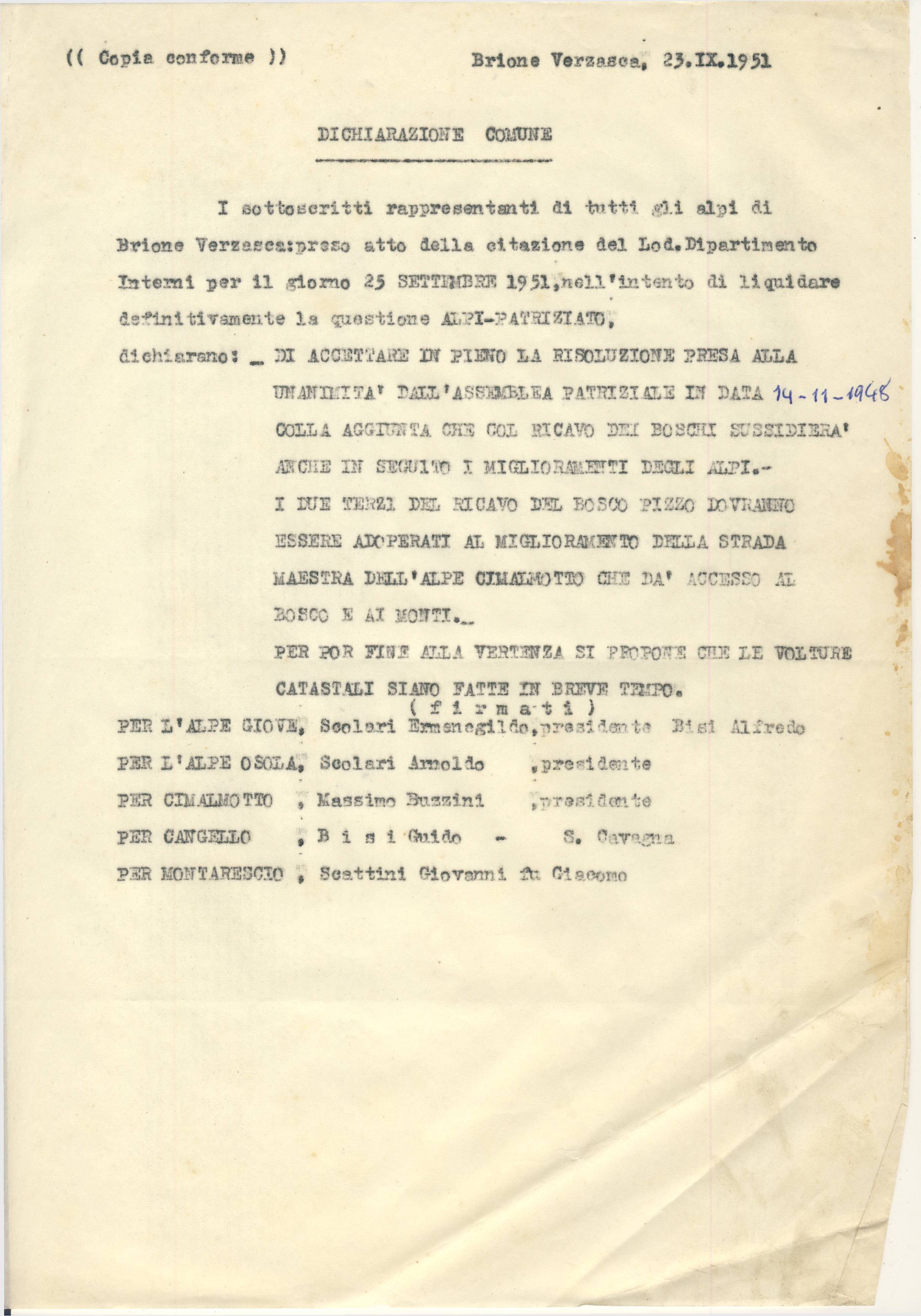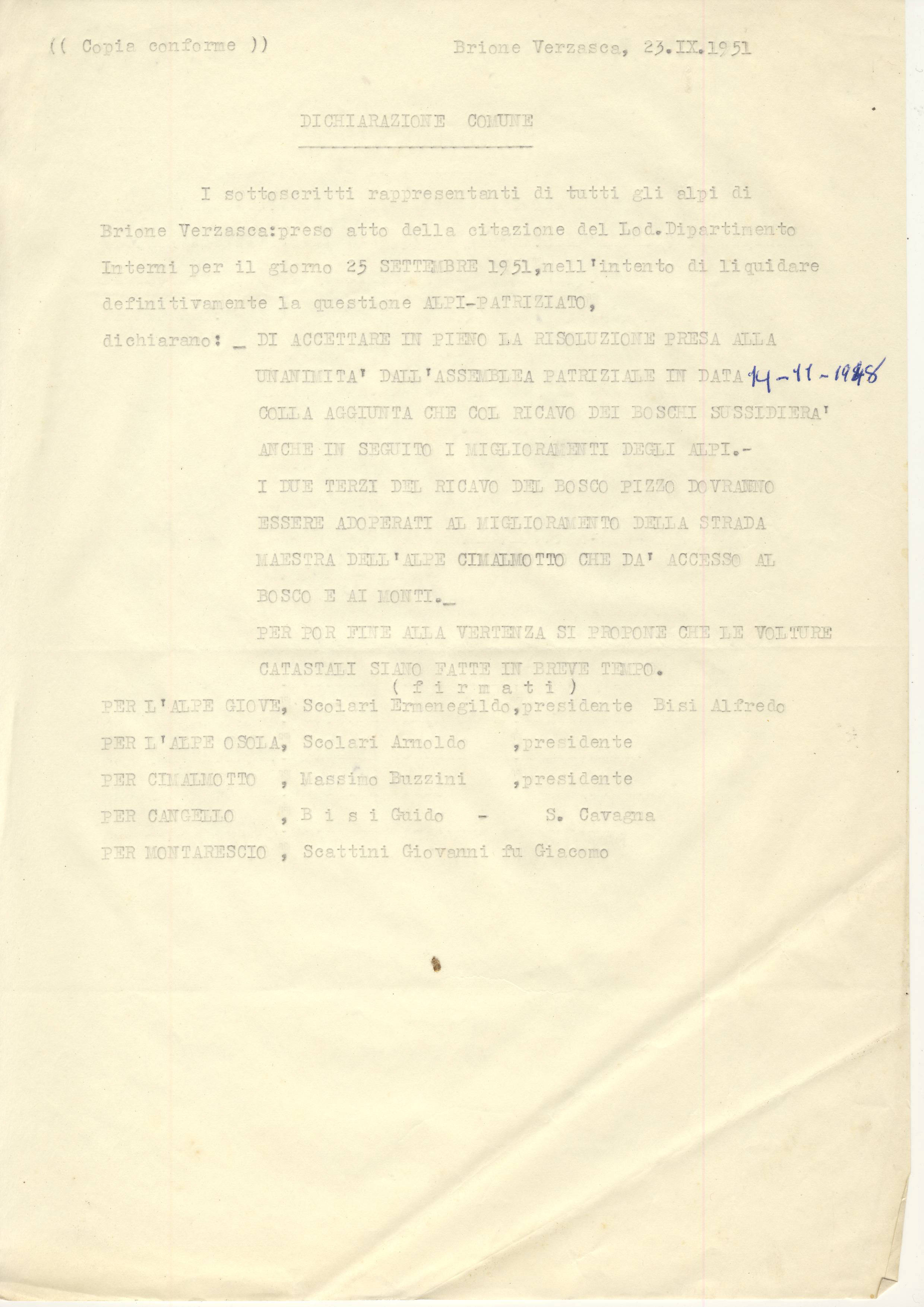 I sottoscritti rappresentanti di tutti .gli alpi di Brione Verzasca: preso atto della citazione del Lod. Dipartimento Interni per il giorno 25 SETTEMBER 1951, nell’intento di liquidare definitivamente la questione ALPI-PATRIZIATO, dichiarano: _ DI ACCETTARE IN PIENO LA RISOLUZIONE PRESA ALLA UNANIMITA’ DALL’ASSEMBLEA PATRIZIALE IN DATA 14-11-1948 COLLA AGGIUNTA CHE COL RICAVO DEI BOSCHI SUSSIDIERÀ’ ANCHE IN SEGUITO I MIGLIORAMENTI DEGLI ALPI.- I DUE TERZI DEL RICAVO DEL BOSCO PIZZO DOVRANNO ESSERE ADOPERATI AL MIGLIORAMENTO DELLA STRADA MAESTRA DELL’ALPE CIMALMOTTO CHE DA' ACCESSO AL BOSCO E AI MONTI.