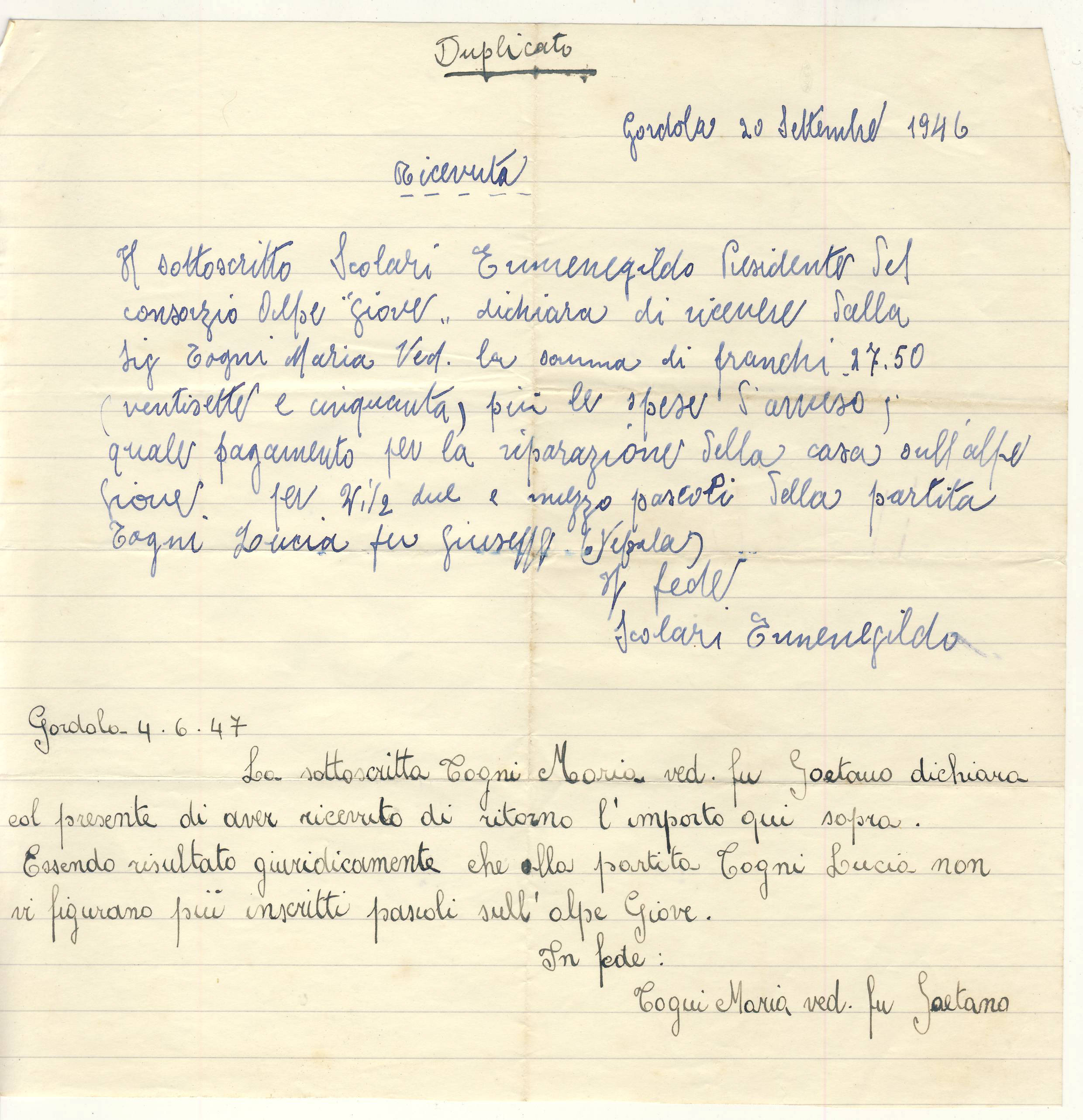 Il sottoscritto Scolari Ermenegildo Presidente del consorzio Alpe "Giove" dichiara di ricevere dalla Sig togni Maria ved. la somma di franchi 27.50 (ventisette e cinquanta) più le spese di avviso quale pagamento per la riparazione della casa sull'alpe Giove, per Ni/2 due e mezzo pascoli della partita Togni Lucia fu Giuseppe (Zepolo)