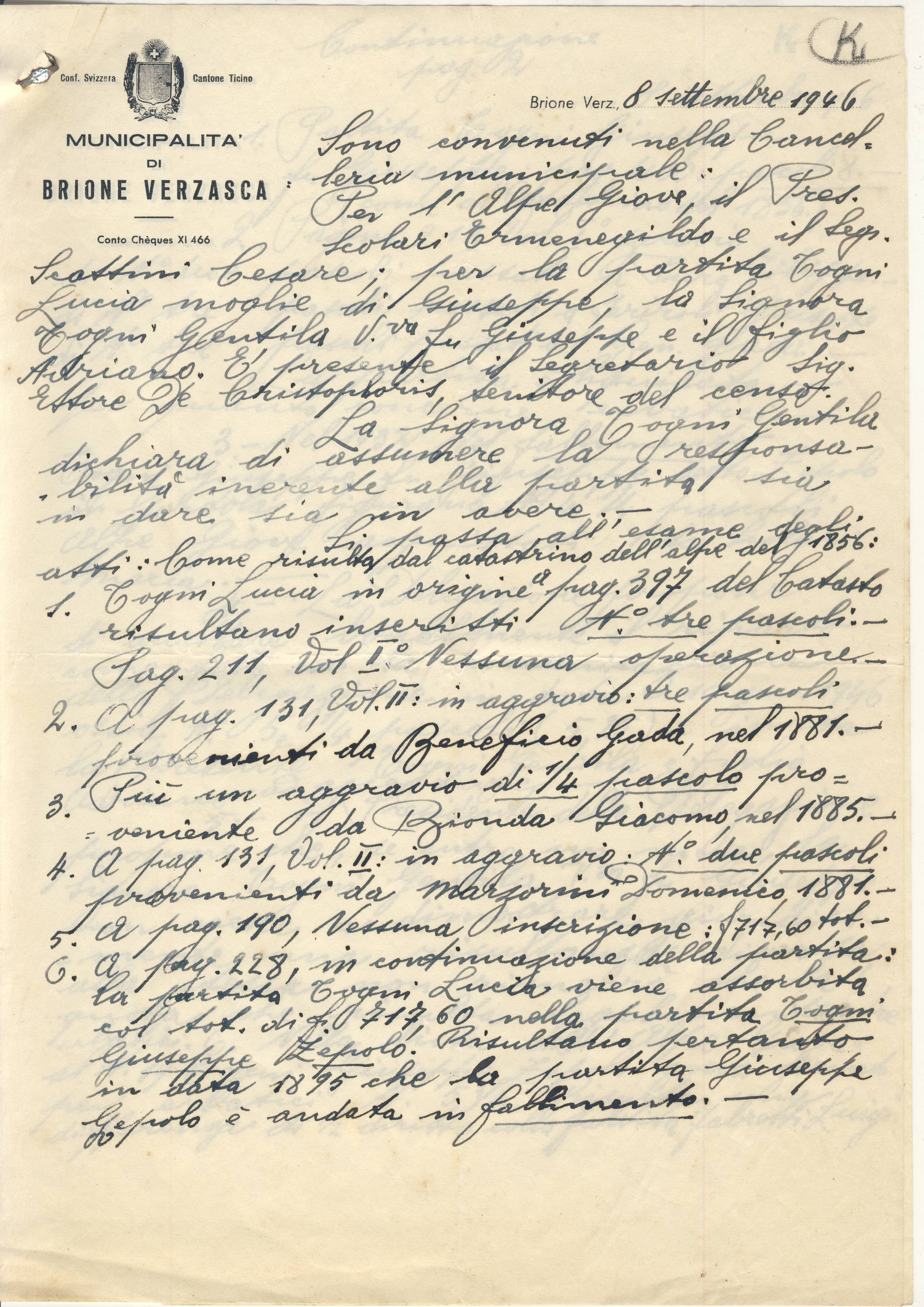 Sono convenuti nella Cancelleria municipale: Per l'Alpe Giove il Pres. Scolari Ermenegildo e il Sig. Scattini Cesare; per la partita Togni Lucia moglie di Giuseppe, la Signora Togni Gentila V.va fu Giuseppe e il figlio Adriano. È presente il Segretario Sig. Ettore De Christophoris, tenitore del censo.