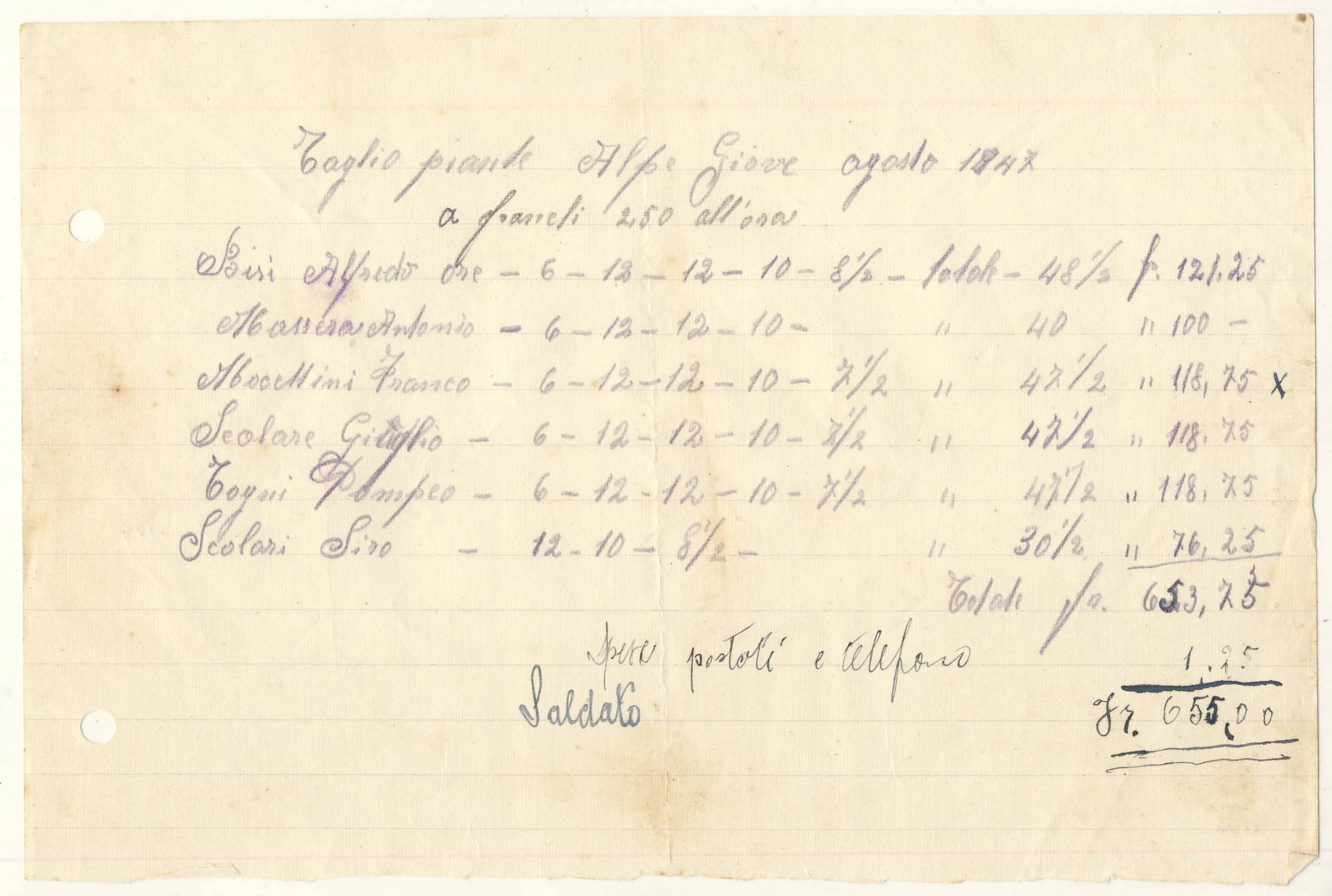 Mocettini Franco ore - 6 - 12-12 - 7½ - totale - 47½ " 118.75