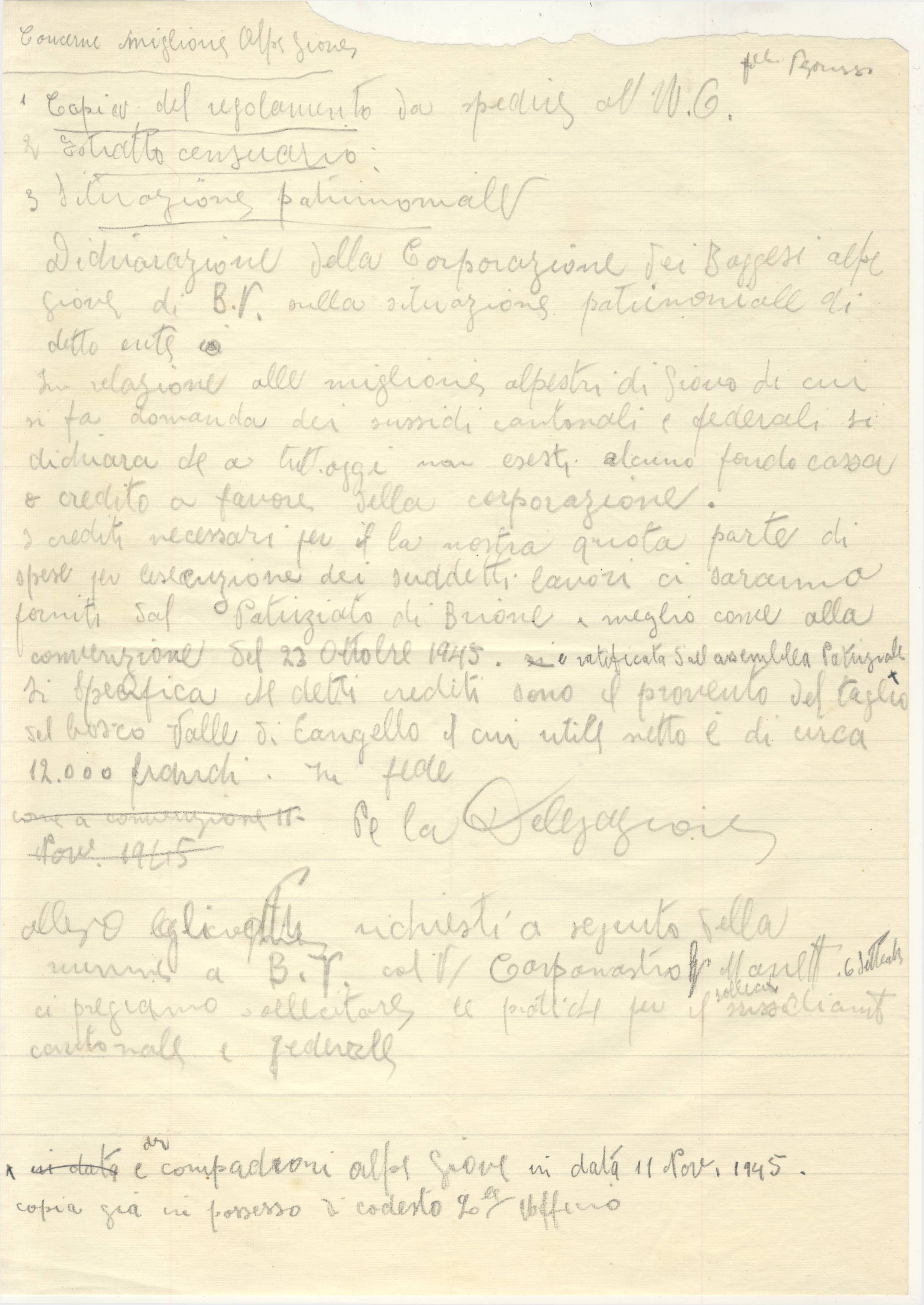 I crediti necessari per il la nostra quota parte di spese per esecuzione dei suddetti lavori ci saranno forniti dal Patriziato di Brione, a meglio come alla convenzione del 23 ottobre 1945. e ratificato dall'assemblea Patriziale*
