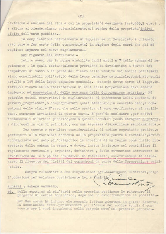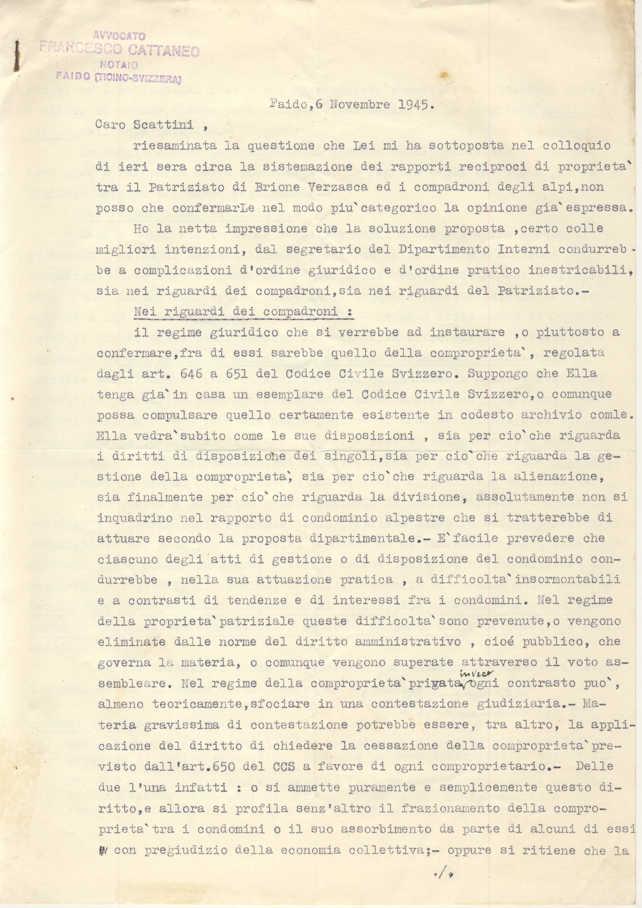 Caro Scattini, riesaminata la questione che Lei mi ha sottoposta nel colloquio di ieri sera circa la sistemazione dei rapporti reciproci di proprietà tra il patriziato di Brione Verzasca ed i compadroni degli alpi, non posso che confermarle nel modo più categorico la opinione già espressa. Ho la netta impressione che la soluzione proposta, certo colle migliori intenzioni, dal segretario del Dipartimento Interni condurrebbe a complicazioni d’ordine giuridico e d’ordine pratico inestricabili, sia nei riguardi dei compadroni, sia nei riguardi del Patriziato.-