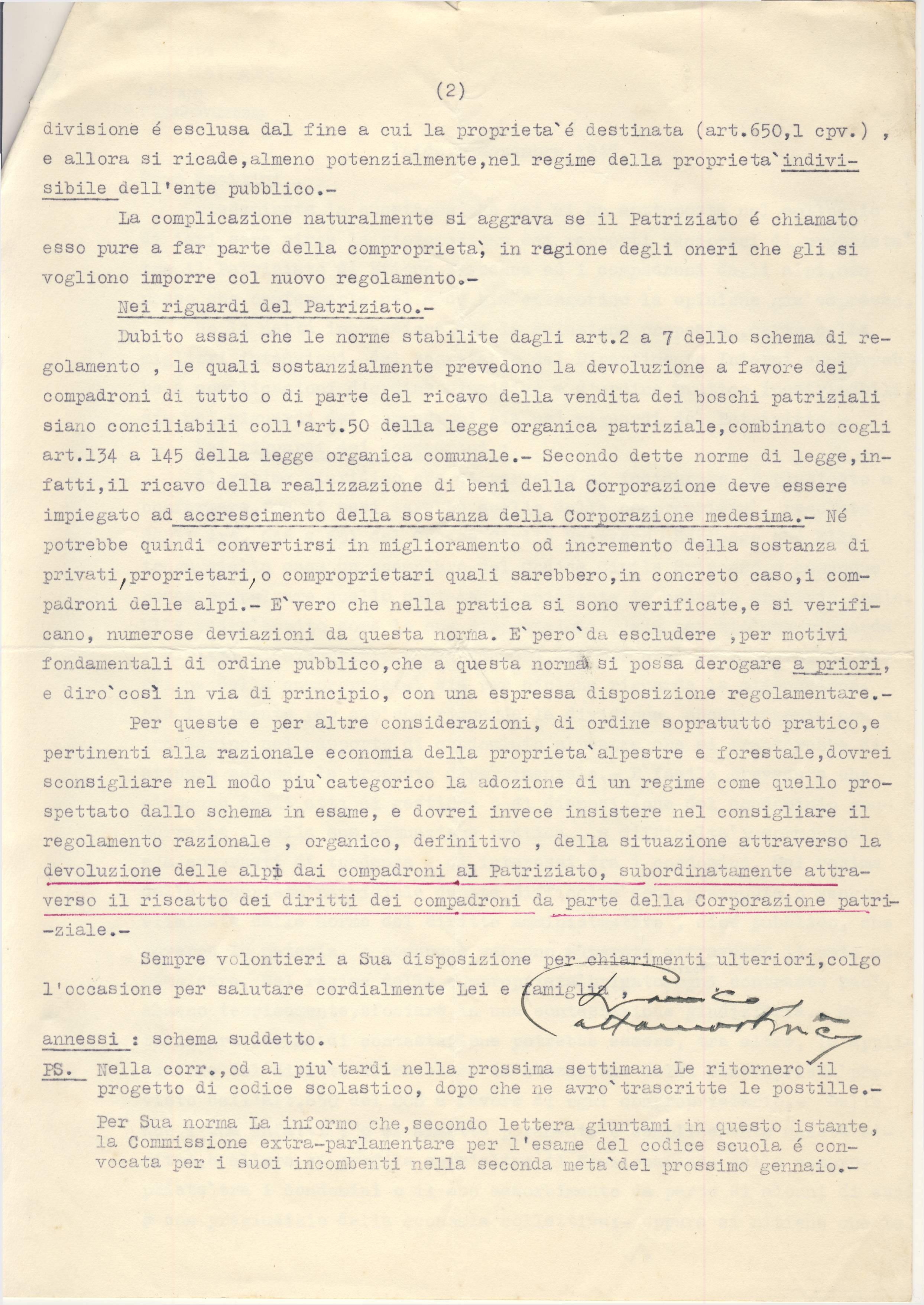 PS. Nella corr., od al più tardi nella prossima settimana Le ritornerò il progetto di codice scolastico, dopo che ne avrò trascritte le postille.- Per Sua norma La informo che, secondo lettera giuntami in questo istante, la Commissione extra-parlamentare per l’esame del codice scuola é convocata per i suoi incombenti nella seconda metà del prossimo gennaio.-