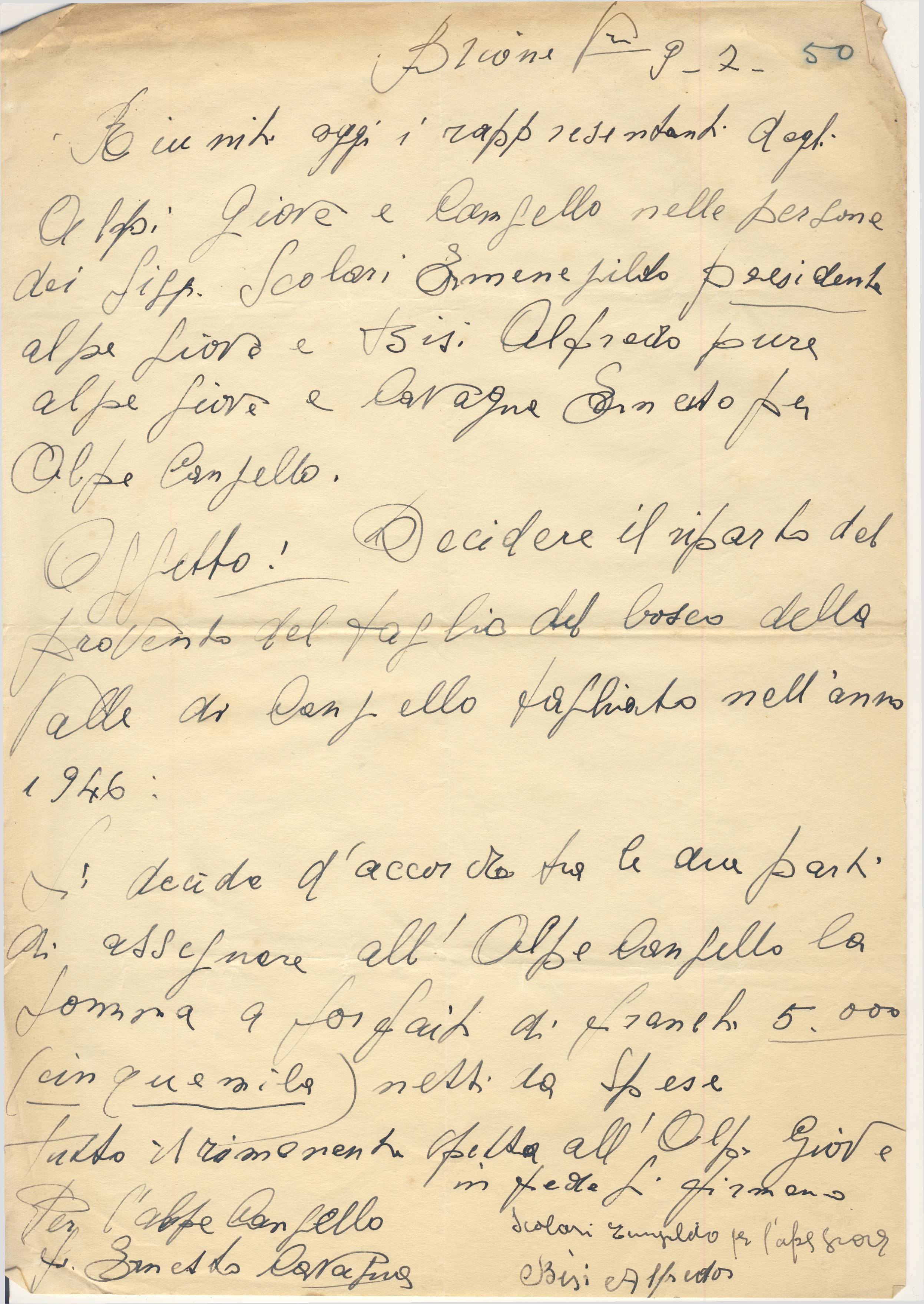 Riuniti oggi i rappresentanti degli Alpi Giove e Cangello nelle persone dei Sigg. Scolari Ermenegildo presidente alpe Giove e Bisi Alfredo pure alpe Giove e Cavagna Ernesto per Alpe Cangello.