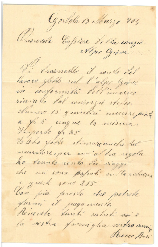 Vi trasmetto il conto del lavoro fatto sul l'Alpe Giove in conformità dell'incarico ricevuto dal consorzio stesso.