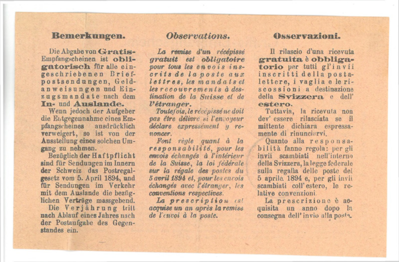 - Ricevuta per invio di 15 fr. per Pietro Bionda.