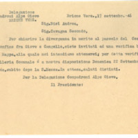 Per chiarire la divergenza in merito al pascolo del Costone, sul confino fra Giove e Cangello, siete invitati ad una verifica bonale della Mappa, alla quale noi intendiamo attenerci; per detta verifica la Cancelleria Comunale é a nostra disposizione Domenica 22 Settembre, alla mattina, subito dopo la S. Messa. In attesa, saluti distinti.