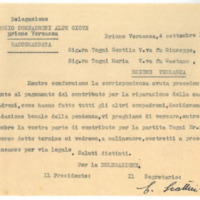 Mentre confermiamo la corrispondenza avuta precedentemente in punto al pagamento del contributo per la riparazione della casa dei compadroni, come hanno fatto tutti gli altri compadroni, desiderando una liquidazione bonale della pendenza, vi preghiamo di versare, entro il 20 p.f. settembre la vostra parte di contributo per la partita Togni Er. fu Lucia. Trascorso detto termine ci vedremo, a malincuore, costretti a procedere all’incasso per via legale.