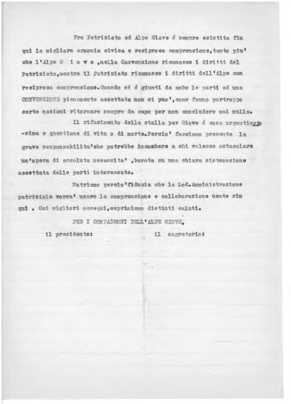 Per quanto concerne l’Alpe Giove fa stato la CONVENZIONE STIPULATA nel 1945 e accettata da ambo le parti. Questa Convenzione é già’ applicata, poiché , avendo dovuto l’Alpe Giove affrontare delle spese urgenti, ha gia’ricevuto dall’onorando Patriziato degli anticipi sulla somma che sara’ versata per le migliorie all’Alpe e rifacimento della stalla, secondo il programma ed i piani approvati sia dal Patriziato , sia dalle Lod. Autorita’ cantonali. Evidentemente una CONVENZIONE, approvata dalle rispettive assemblee puo’essere modificata solo col consenso delle due assemblee interessate..Sia da parte dell’Alpe, sia da parte del Patriziato é allo studio la FORMULA DA ADOTTARE PER LA INSCRIZIONE AL REGISTRO FONDIARIO DEFINITIVO. Questa formula deve essere studiata tra le parti interessate con buona volontà’ e buona armonia, mentre il ricorrere eventualmente alla via giudiziaria sarebbe un ripetere l’esperienza gia’ fatta ai tempi della divisione con Gerra Verzasca, uno spreco di tempo e di denaro...-