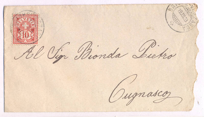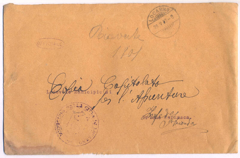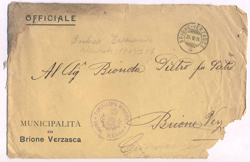 Busta vuota. Dal timbro sembra del 1903. Scritta a mano in due momenti, su busta scritta al Municipio di Brione
