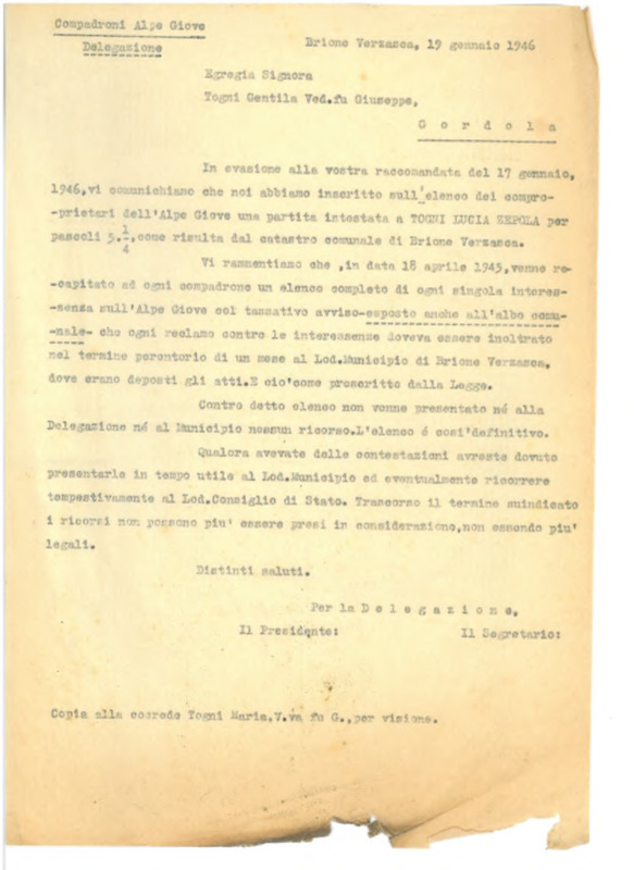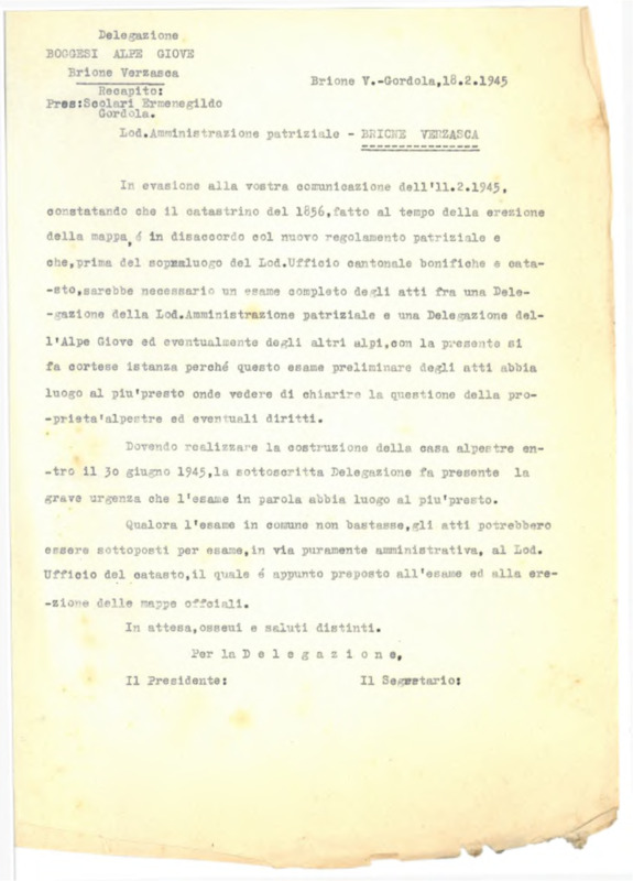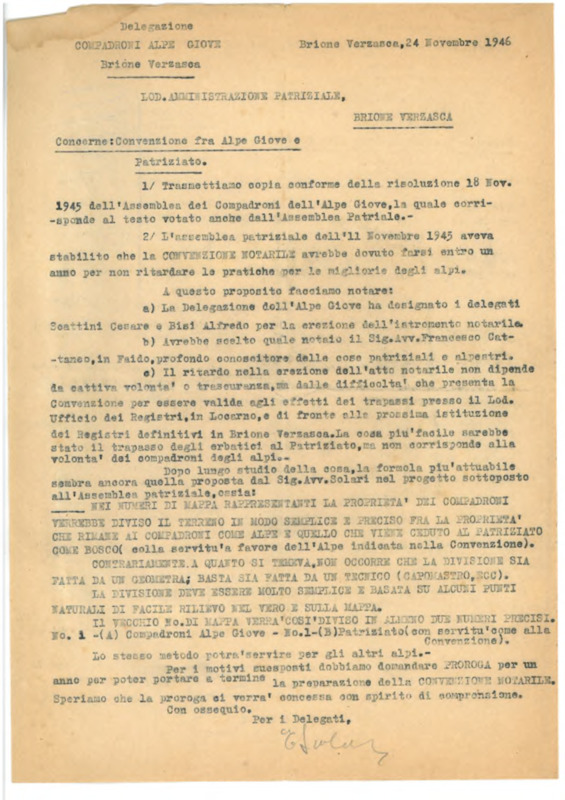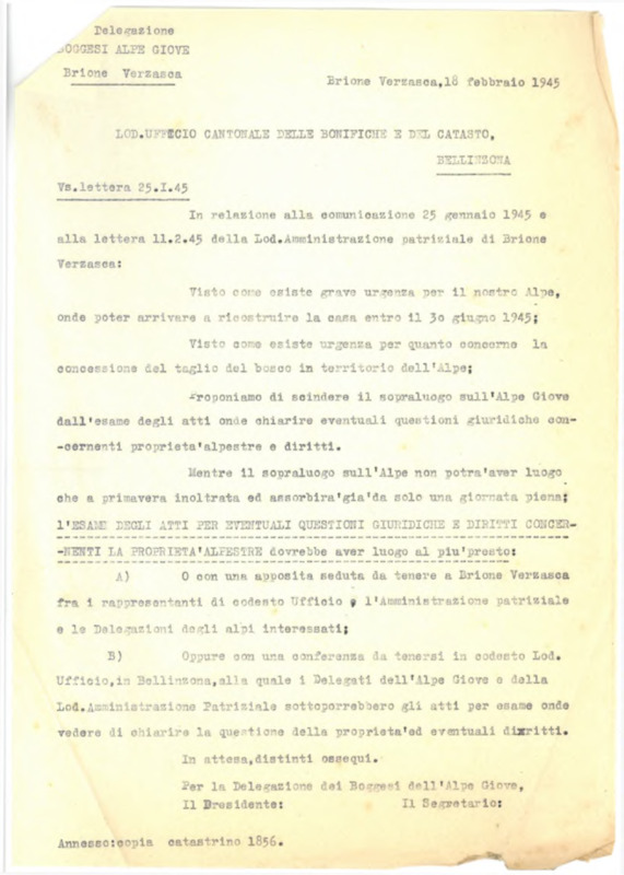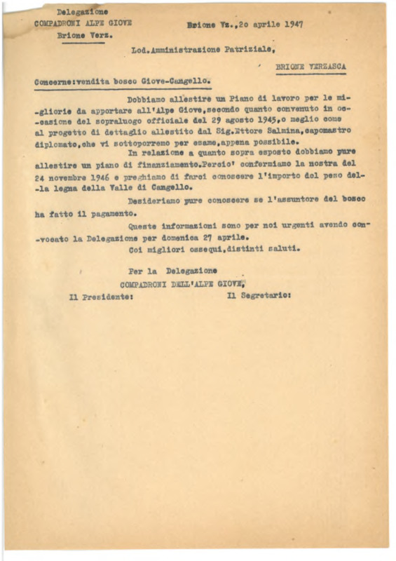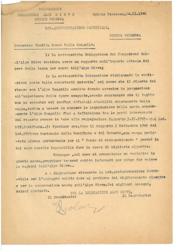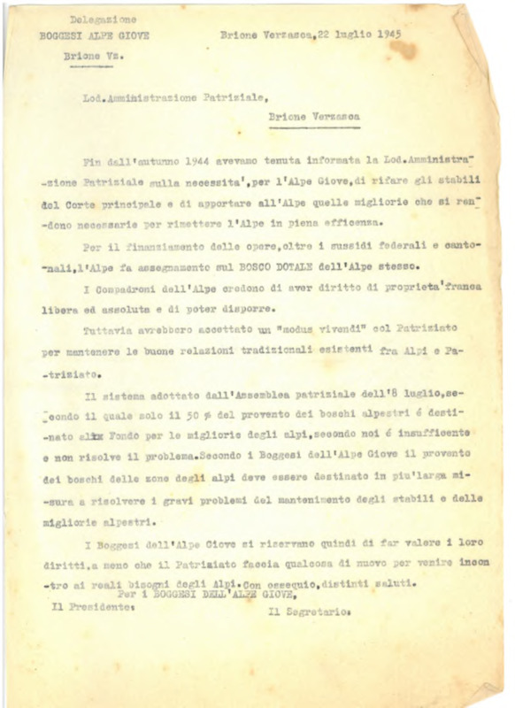 Fin dall’autunno 1944 avevamo tenuta informata la Lod. Amministrazione Patriziale