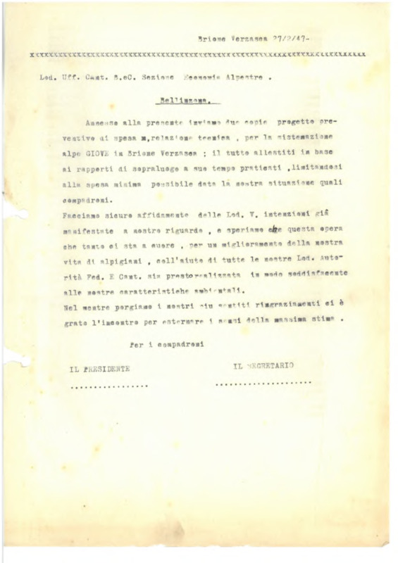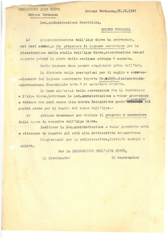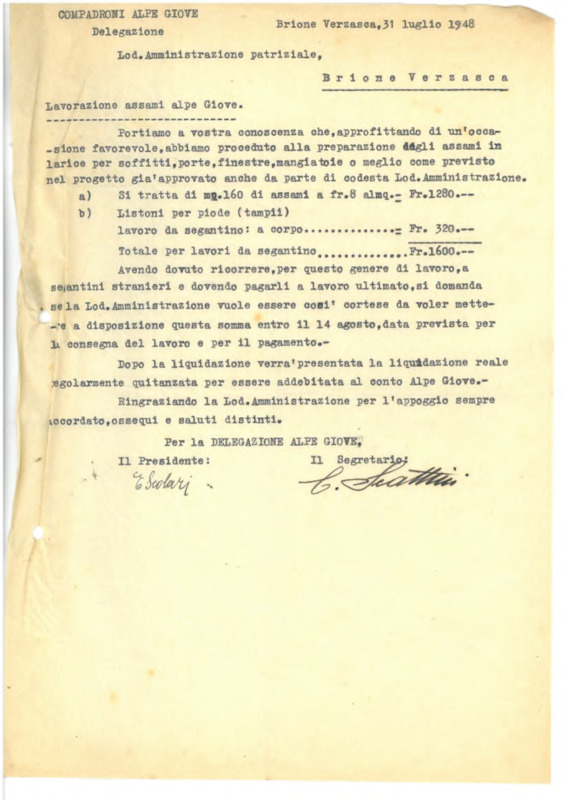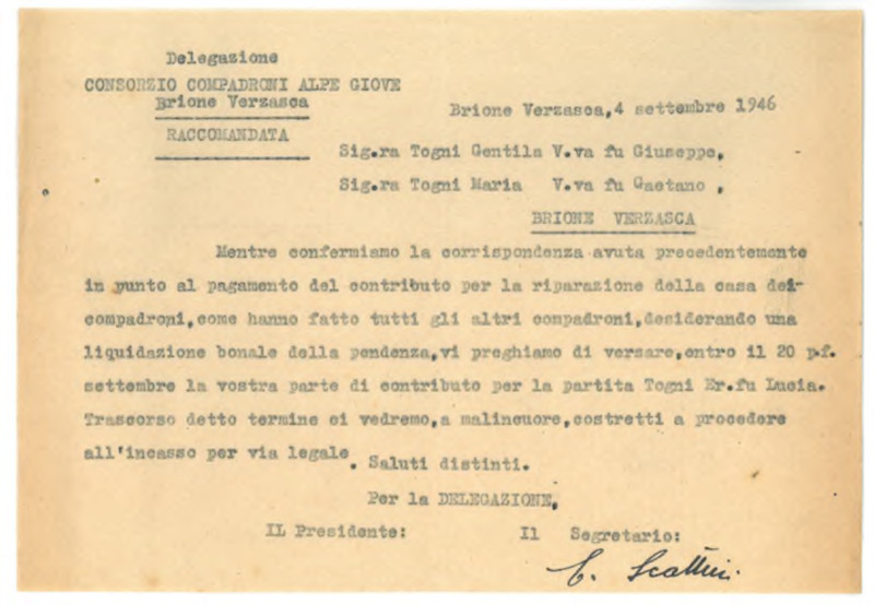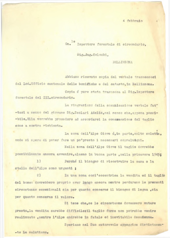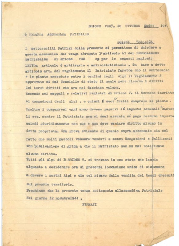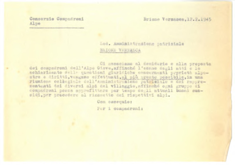 Fin dall’autunno 1944 avevamo tenuta informata la Lod. Amministrazione Patriziale